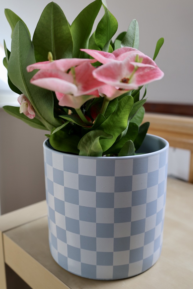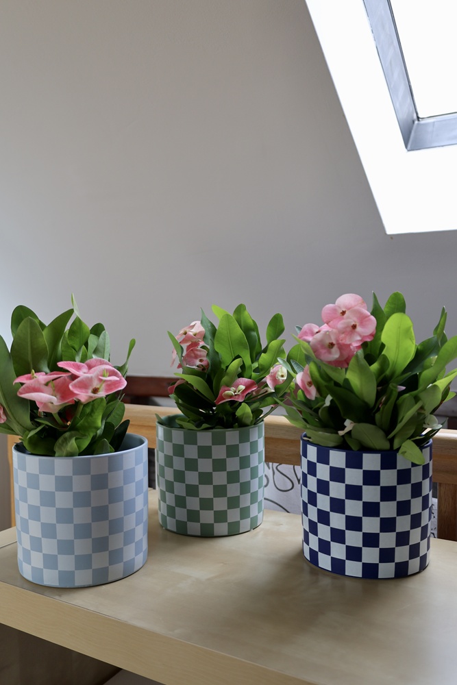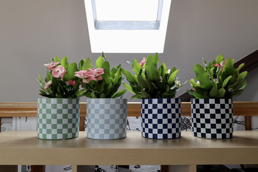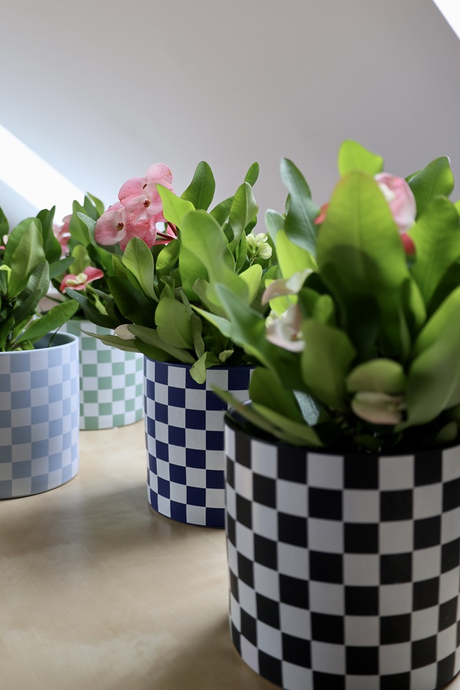 Ceramiczna osłonka doniczkowa o prostej, nowoczesnej formie walca, zwracająca uwagę efektowną biało-błękitną kratką. Jej minimalistyczny kształt i kontrastujące kolory kratki nadają całości elegancji i tworzą dynamiczny efekt wizualny. Gładka powierzchnia i harmonijne proporcje sprawiają, że doniczka doskonale wpisuje się w różnorodne nowoczesne wnętrza od skandynawskich aranżacji po bardziej odważne designerskie przestrzenie. Doniczka o oryginalnym, dekoracyjnym, ożywiającym wnętrze charakterze.