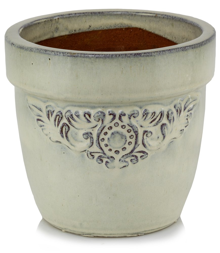 Ceramiczna, masywna donica zarówno do aranżacji ogrodowych, jak i do przestrzeni domowych. W pełni odporna na czynniki zewnętrzne mróz, słońce czy wodę. Donicę zdobi klasyczny, pełen finezji ornament i szeroki, płaski rant stanowiący efektowne wykończenie górnej części. Doniczka pełna kunsztu i ponadczasowej elegancji.