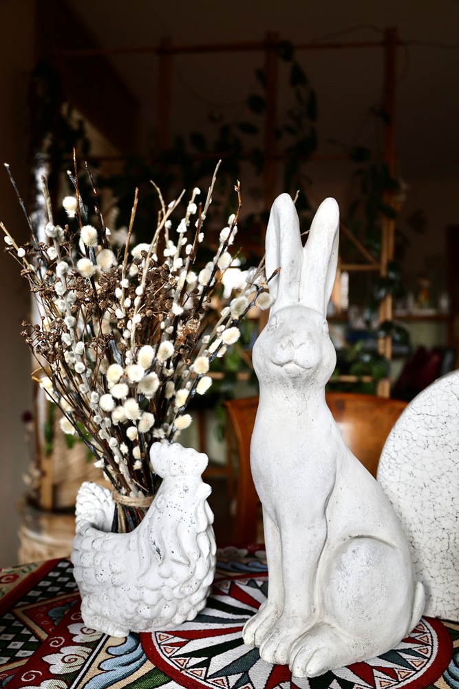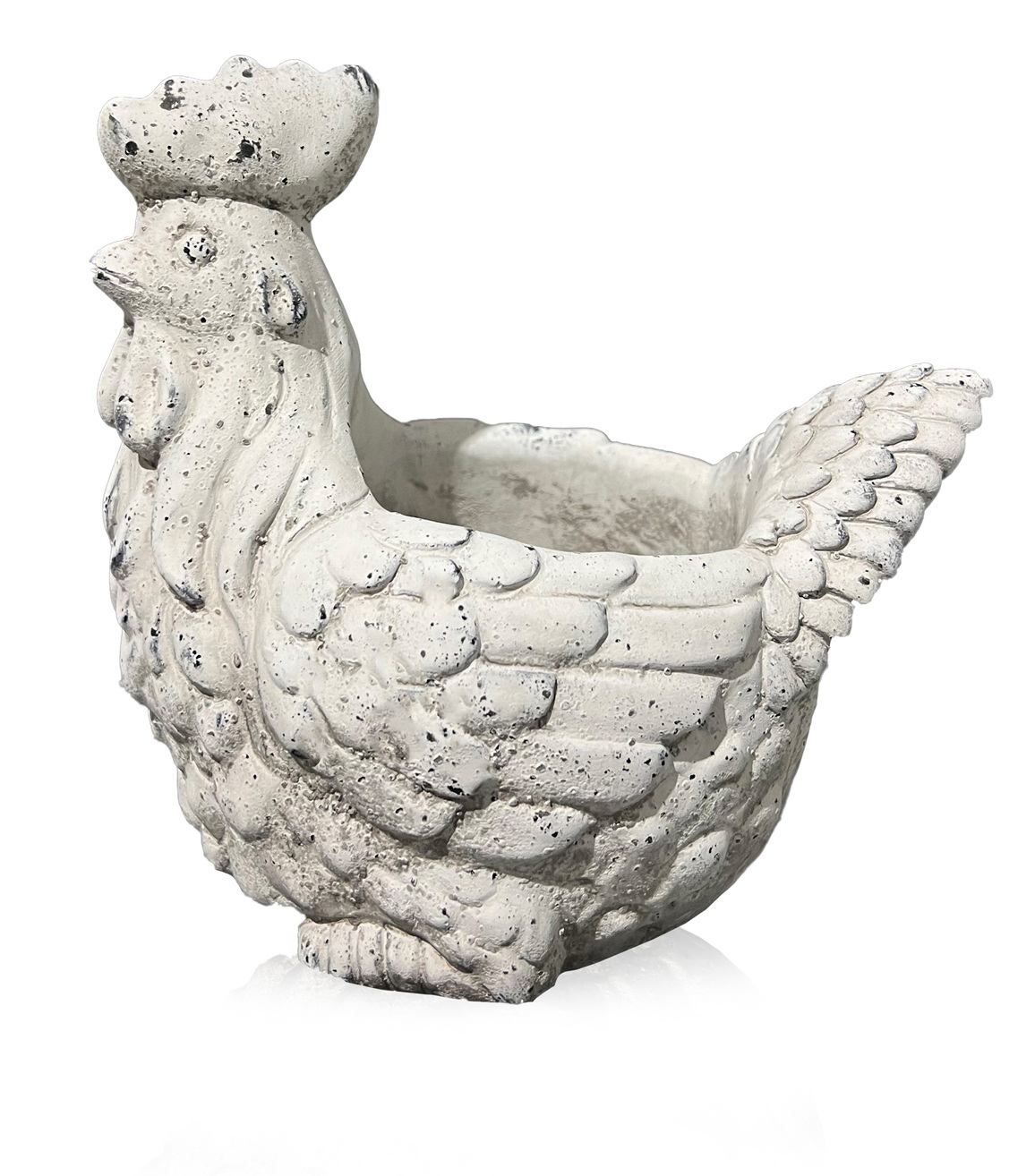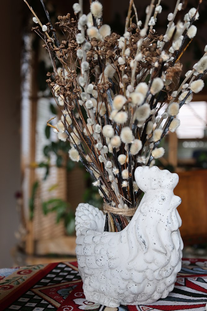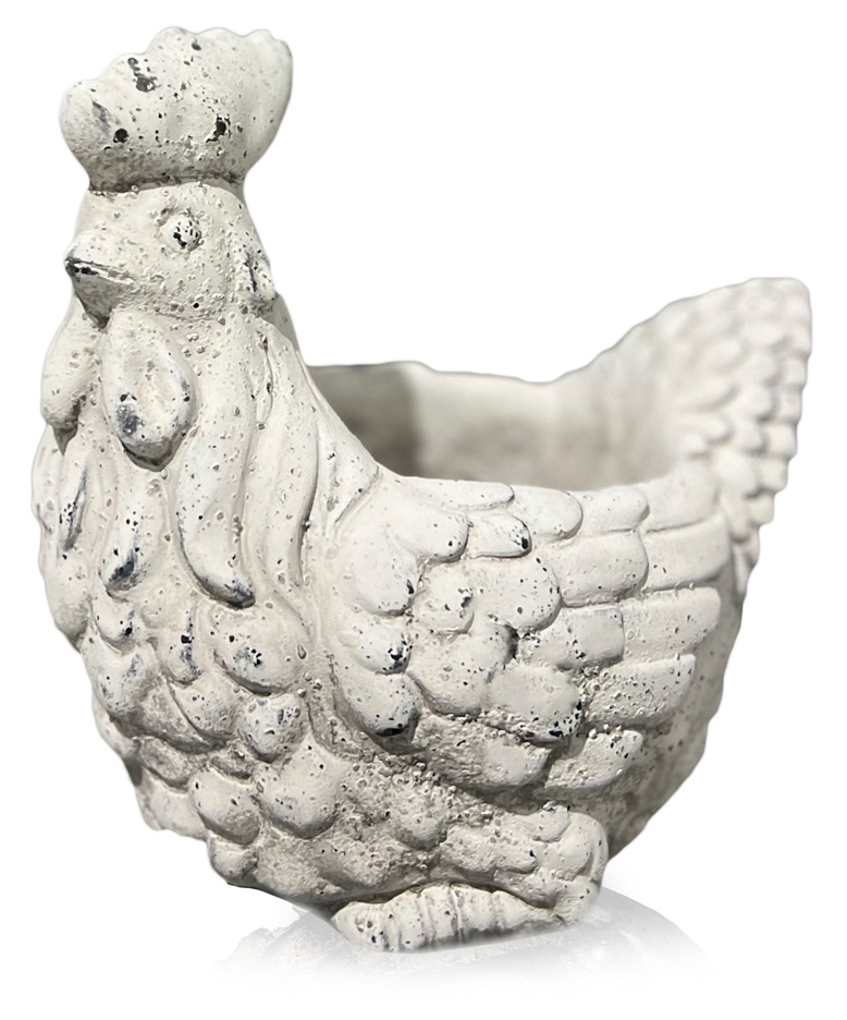 Stylizowana kurka z zabawnie przerysowanym brzuszkiem nasuwającym pogodne skojarzenia i stanowiącym jednocześnie stabilną podstawę. W górnej części figurka posiada zagłębienie, idealne na świąteczne dekoracje. Możemy na przykład wykorzystać je na zasianie rzeżuchy, owsa lub ozdobić małymi jajeczkami.  Kurka pięknie komponująca się z rustykalnymi aranżacjami, ale również pasująca do nowoczesnych wnętrz. Figurka wnosząca dużo uroku w wielkanocnych dekoracjach świątecznych.