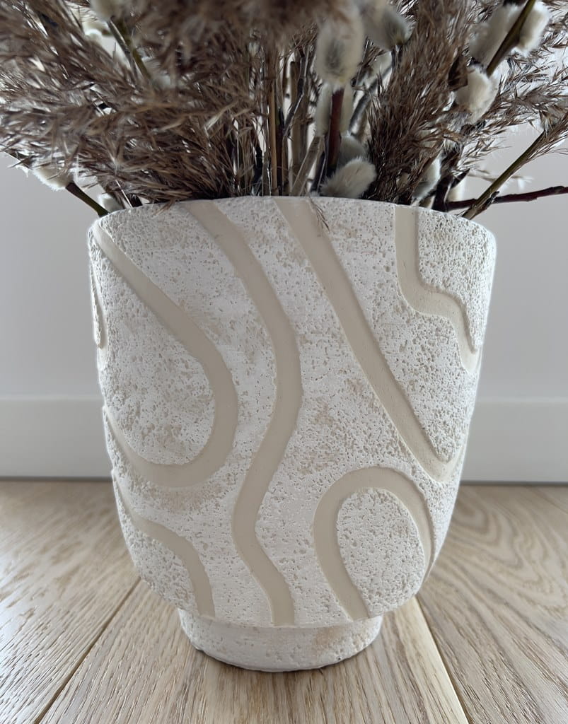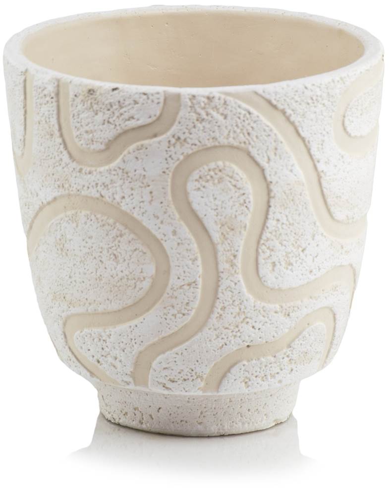 Ceramiczna osłonka doniczkowa wyróżniająca się wyjątkowo urokliwą, gąbczastą strukturą zewnętrznej ścianki na tle kremowo – beżowego wijącego się wzoru. Lekkości i delikatności nadaje doniczce uniesienie jej nad ziemią poprzez kształt, z podstawą o dużo mniejszej średnicy. Bardzo szlachetna, oszczędna w formie propozycja, wpisująca się w nowoczesny, artystyczny design.