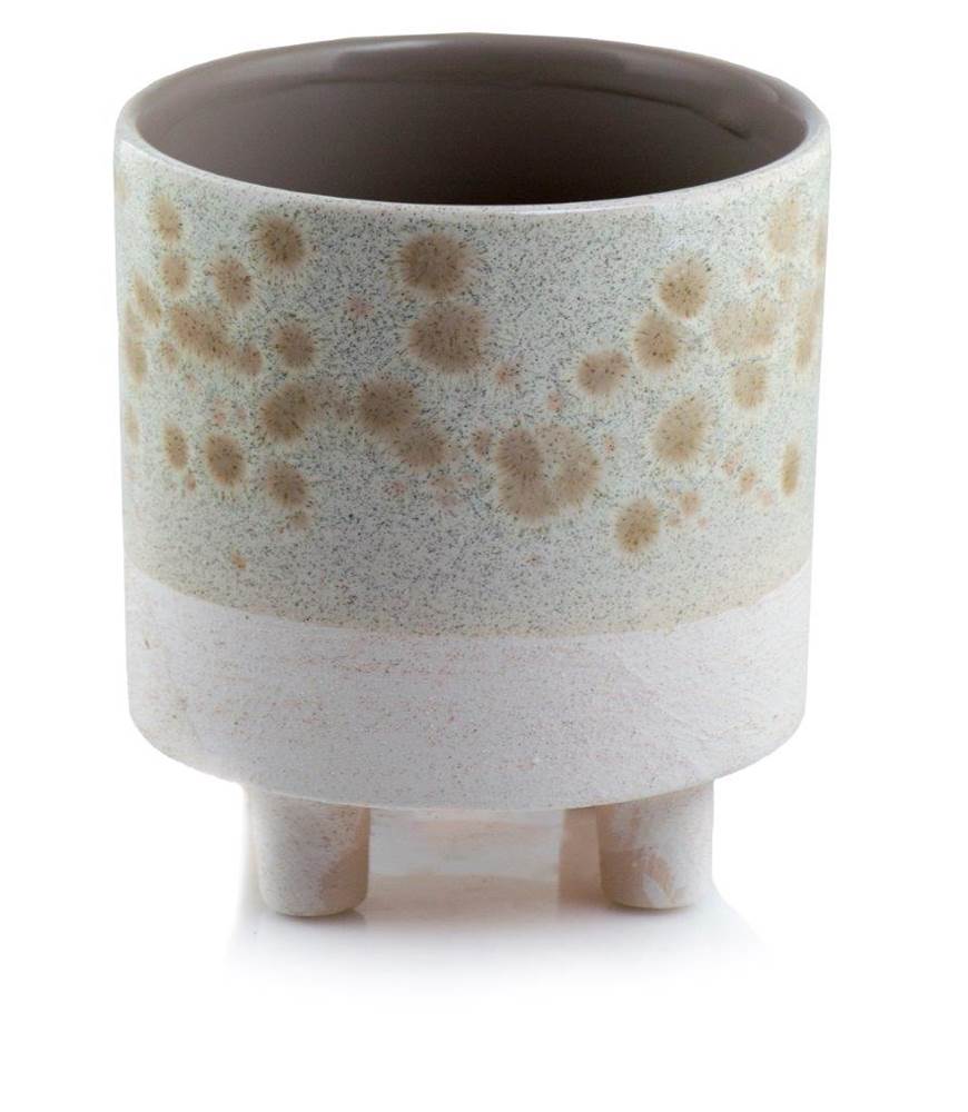 Ceramiczna osłonka doniczkowa w kształcie walca na czterech zgrabnych, nadających jej lekkości nóżkach. Jasnobeżowa, kremowa kolorystyka z subtelnymi odcieniami brązu w formie delikatnych plamek, podkreślających wyjątkową fakturę. Donica stanowi samodzielną, nietuzinkową dekorację, podkreślającą urok roślin w delikatny, niedominujący sposób.