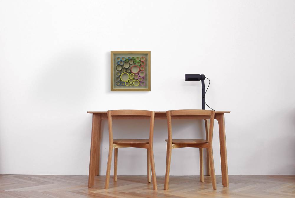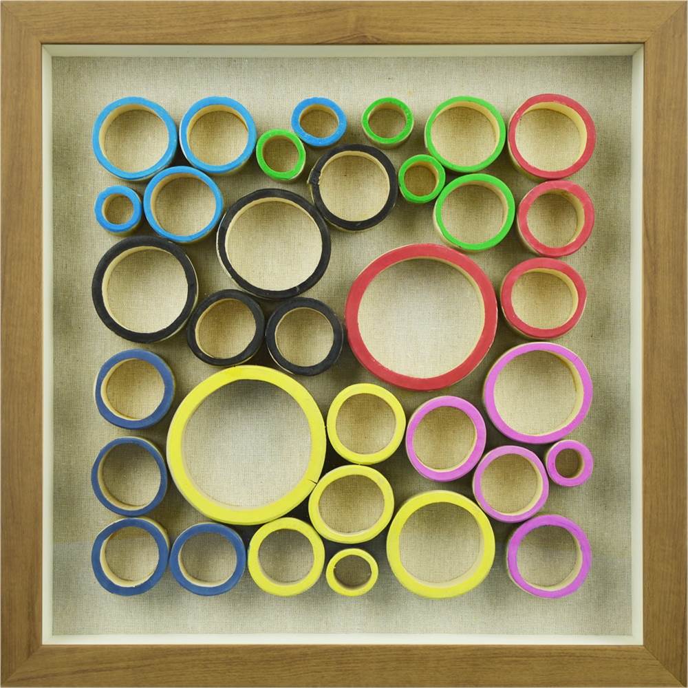 Radosna kolorowa kompozycja z krążków bambusowych. Oryginalna, wyważona forma i ponadczsowa prostota łączy się z ciekawym pomysłem wzorniczym. Dla miłośników niekonwecjonalnych, pomysłowych dekoracji.