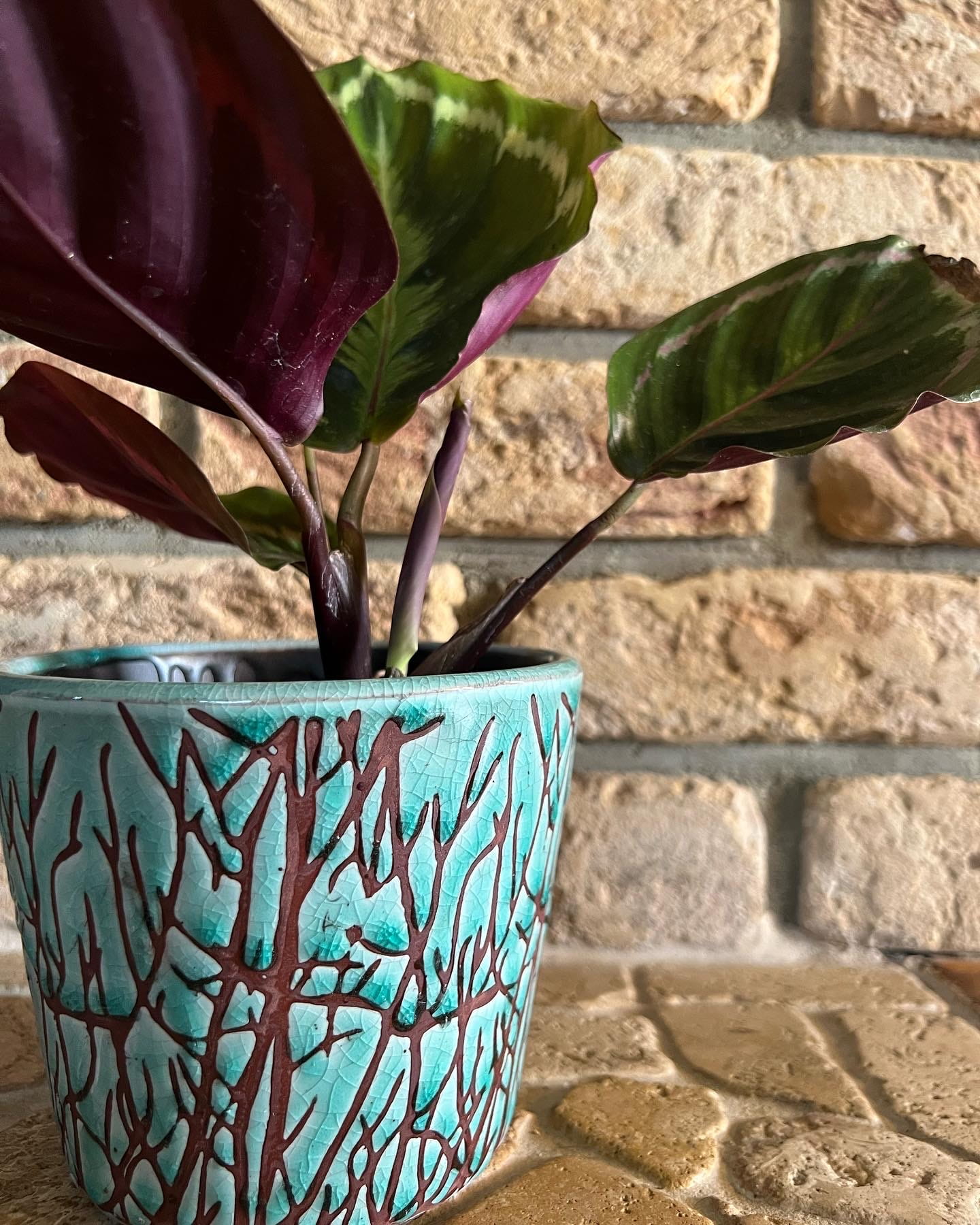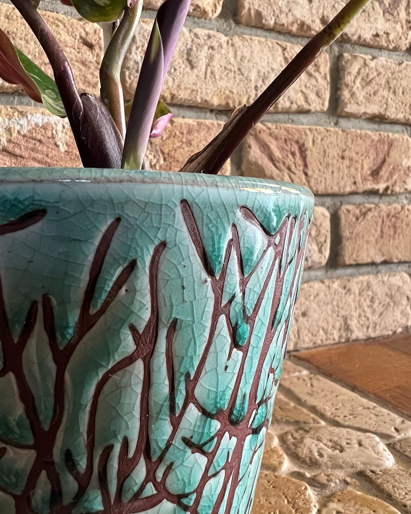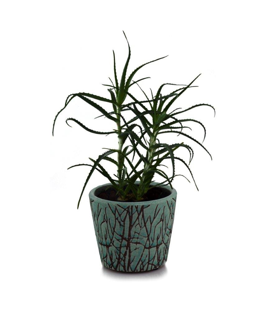 Ceramiczna osłonka doniczkowa o klasycznym trapezowym, ponadczasowym, pięknym w swojej prostocie kształcie. Nigdy nie wychodzącym z mody, mający rzesze wielbicielek i wielbicieli. Kształt harmonijnie współgra z wyjątkową atrakcyjną, oryginalną kolorystyką oscylującą pomiędzy lazurem a turkusem, z rozsypanymi na całej powierzchni gałązkami. Delikatnie stylizowane gałązki tworzą piękną kompozycję wzorniczą, a turkusowe lekko postarzane tło z licznymi, celowymi, drobnymi pęknięciami szkliwa stanowi jej doskonałe uzupełnienie. Uniwersalna, ale zaskakująca innością stylistyka z pewnością wniesie powiew świeżości i w ciekawy sposób dopełni Państwa zielone aranżacje.