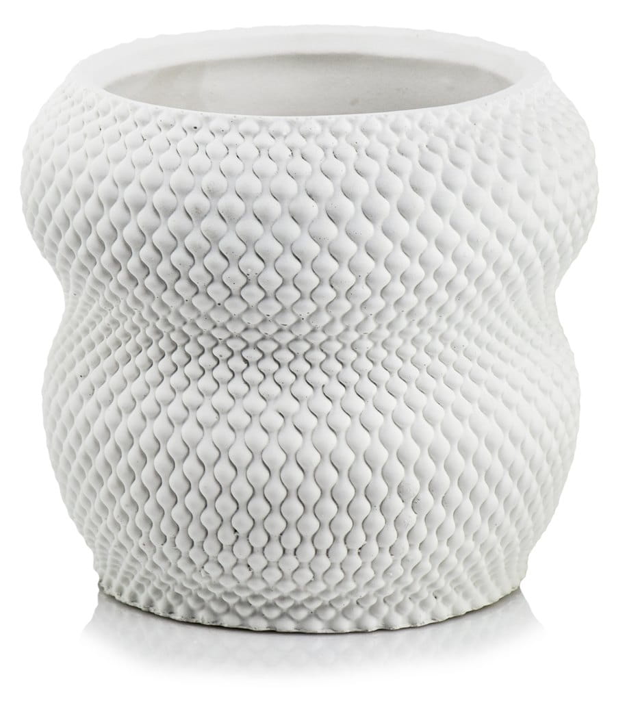 Ceramiczna osłonka doniczkowa lub wazon wybór należy do Ciebie, ta ozdoba stanowi udane połączenie tych obu przeznaczeń. Wykonana z najwyższą starannością o detale, wzór pięknie zarysowany w postaci mijających się faliście, wypukłych zaokrągleń. Nadający całości efektu przestrzennej trójwymiarowości w połączeniu maestrią zdobniczą tworzą spektakularny efekt. Biel nadaje całości szlachetności i neutralności, pozwalając w całości skupić się na wzornictwie. Stylistyka łącząca w sobie prostotę i wyrafinowaną estetykę.