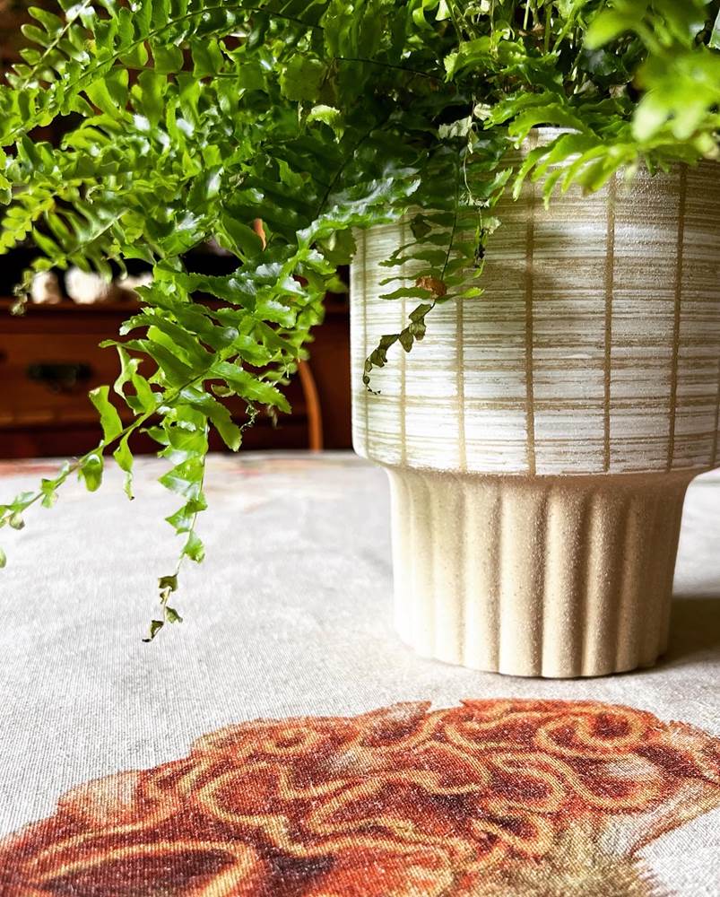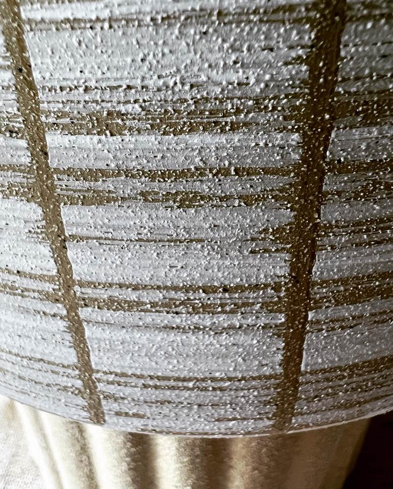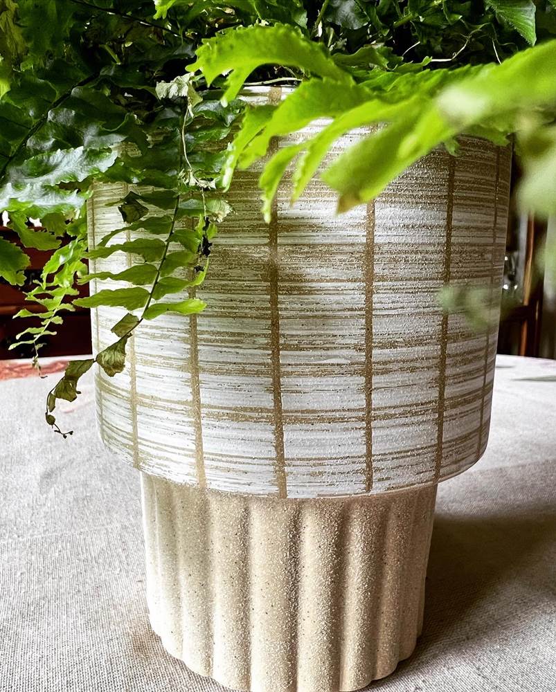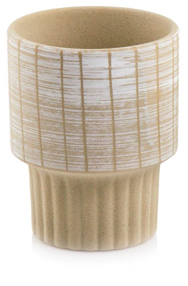 Ceramiczna osłonka doniczkowa o bardzo ciekawym kielichowym kształcie. Dół z wyraźnymi karbowaniami na piaskowo-beżowym tle, w górnej części dużo się dzieje, pionowe pasy spotykają się z biało-beżową poziomą przecierką. Mimo dużej ilości zdobień wszystko jest tu wyważone i spójne, idealnie ze sobą dobrane, pięknie współgrające z zielenią roślin. Doniczka pasująca do nowoczesnych, minimalistycznych wnętrz dodając im przytulności i ciepła.