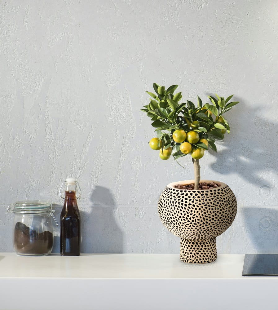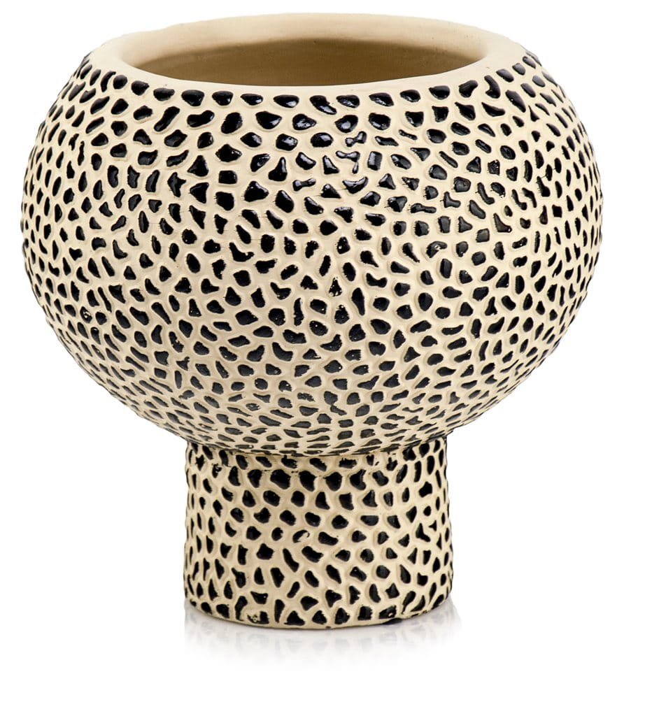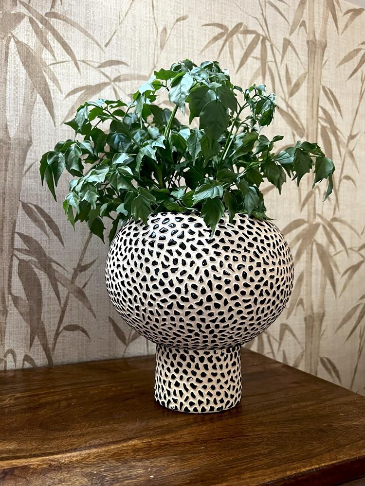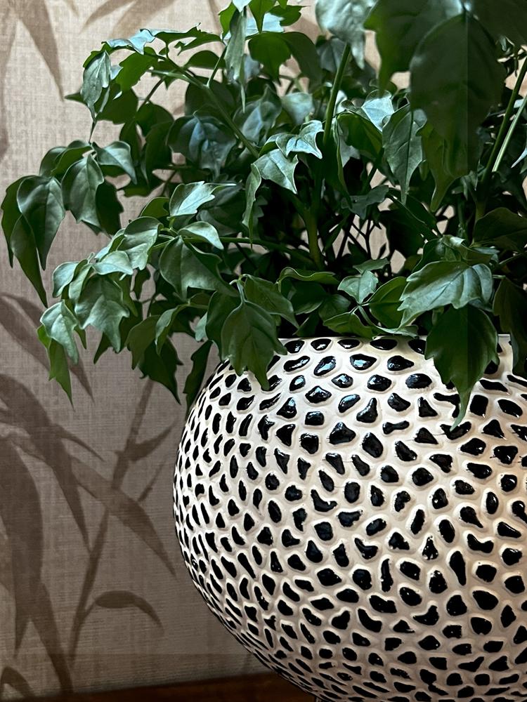 Ceramiczna osłonka doniczkowa o wyjątkowej, przypominającej cętki geparda fakturze, struktura wzoru jest wypukła, pięknie wykonana z dbałością o każdy szczegół. Zwierzęce printy od zawsze mają wielu zwolenników, a tu wyglądają bardzo subtelnie i szlachetnie. Doniczka o niezwykłym rzadko spotykanym kształcie, duża kulista forma, jakby unosząca się nad powierzchnią, oparta na nadającej jej lekkości nóżce. Idealna dla roślin posiadających zwisające pędy, ale i inne rośliny będą się w niej ciekawie prezentowały. Doniczka dzięki swojej naturalnej fakturze i ponadczasowemu wzornictwu doda uroku każdemu miejscu, tworząc ozdobne akcenty przykuwające i zatrzymujące wzrok.