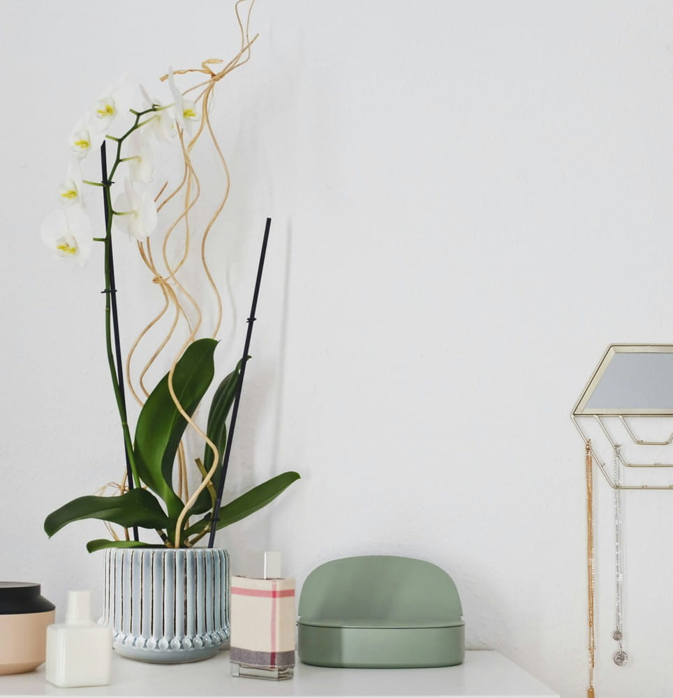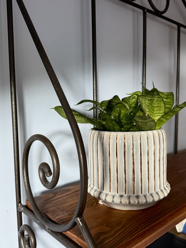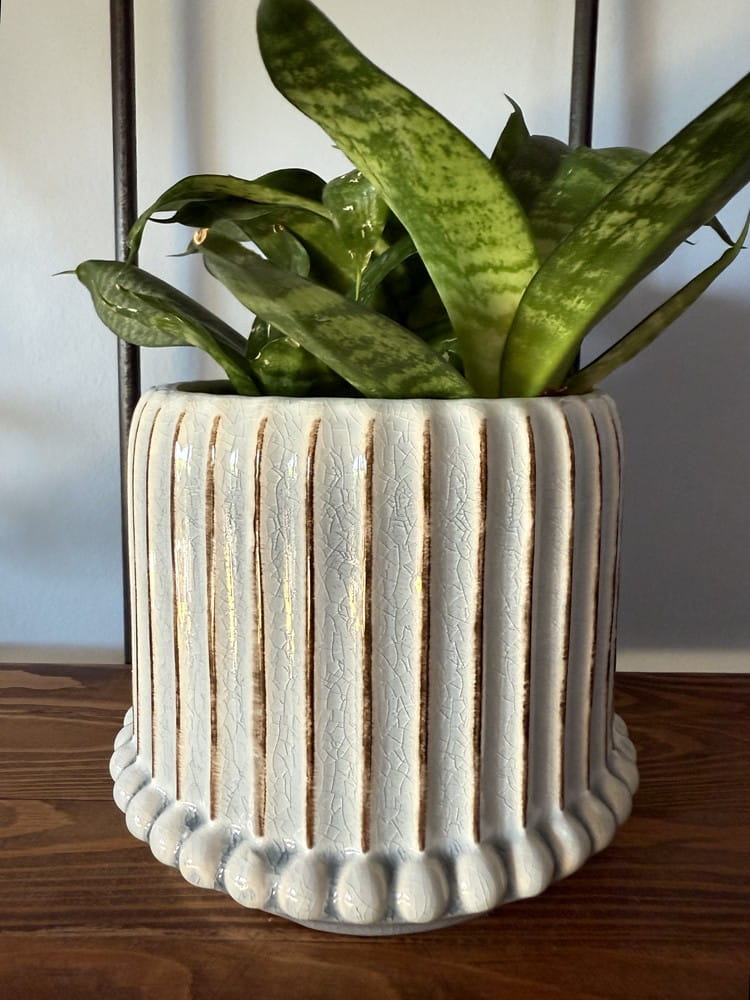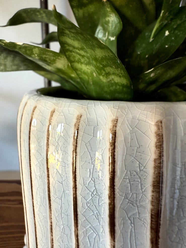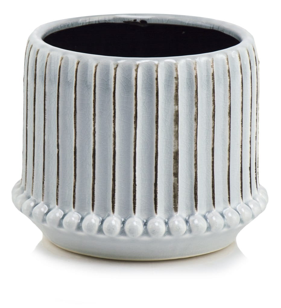 Ceramiczna osłonka doniczkowa urzekająca prostym ryflowanym wzornictwem i z dodającym uroku wykończeniem dolnej części w postaci „ koralików”, połączonych z biżuteryjnym smakiem. Stonowana błękitno-stalowa kolorystyka z brązowymi pionowymi paskami, delikatnie uwypukla spokojny design doniczki. Projekt subtelny i ozdobny zarazem o szlachetnym, eleganckim charakterze, będący uroczym dodatkiem do każdego wnętrza.