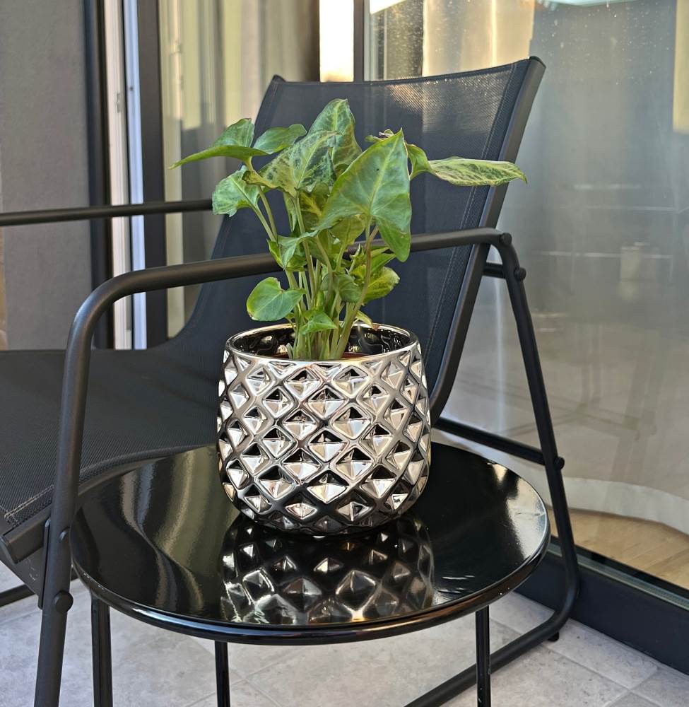 Jej lustrzana powierzchnia świetnie komponuje się z nowoczesnymi i minimalistycznymi wnętrzami, gdzie może służyć jako efektowny pojemnik na sukulenty, małe kaktusy lub inne rośliny o zwartym pokroju. Pamiętaj, że średnica otworu (miejsca na ziemię) wynosi około 12,5 cm – to dobry parametr przy doborze odpowiedniej rośliny lub wewnętrznej osłonki. Postawiona na konsoli, komodzie lub biurku, stanie się błyskotliwym, dekoracyjnym akcentem, który przyciąga wzrok.