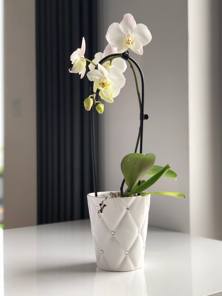 Okrągła, elegancka doniczka ceramiczna, która dzięki zwężonym ściankom jest doskonale dopasowana do standardowych rozmiarów storczyków. Wykonana z cienkościennego dolomitu i ozdobiona połyskującymi cyrkoniami, wprowadza do wnętrza odrobinę stylu glamour. To propozycja dla osób, które szukają dekoracyjnej osłonki do salonu, sypialni lub łazienki.