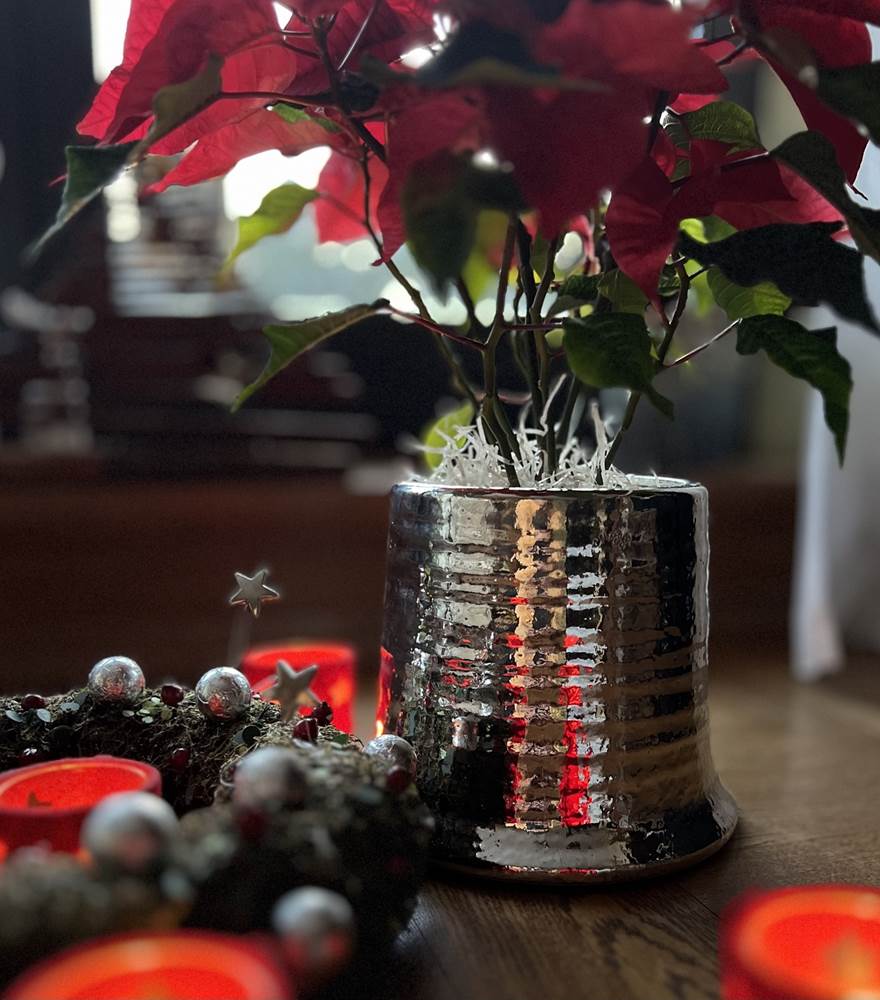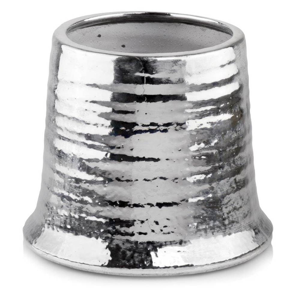 Ceramiczna osłonka doniczkowa o bardzo ciekawym, nietuzinkowym kształcie przypominającym krawiecki naparstek. Powierzchnia zewnętrzna pokryta jest delikatnym frezowaniem, przypominający ceramikę formowaną ręcznie na kole garncarskim. Ceramika pokryta srebrem jest zawsze akcentem dodającym elegancji i prestiżu. Z zielenią tworzy wysmakowaną kompozycję przykuwającą wzrok, subtelnym srebrnym blaskiem. Jest to propozycja stonowana, szlachetna w swoim wyrazie, prosta w formie, cechy te stanowią o jej dużym dekoracyjnym potencjale.