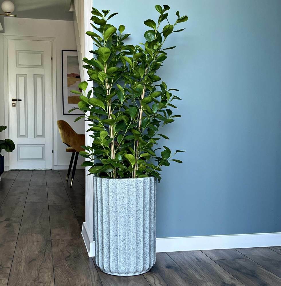 Cylindryczny kształt i pionowe linie optycznie wydłużają przestrzeń, dlatego model świetnie sprawdzi się w roli pojedynczego, wyrazistego akcentu w pokoju czy holu. Dzięki opcjonalnemu odpływowi masz pełną swobodę – możesz użyć jej jako klasycznej donicy do roślin wymagających drenażu lub jako praktycznej osłonki, która chroni meble przed wilgocią. Pamiętaj, że produkt nie jest mrozoodporny.