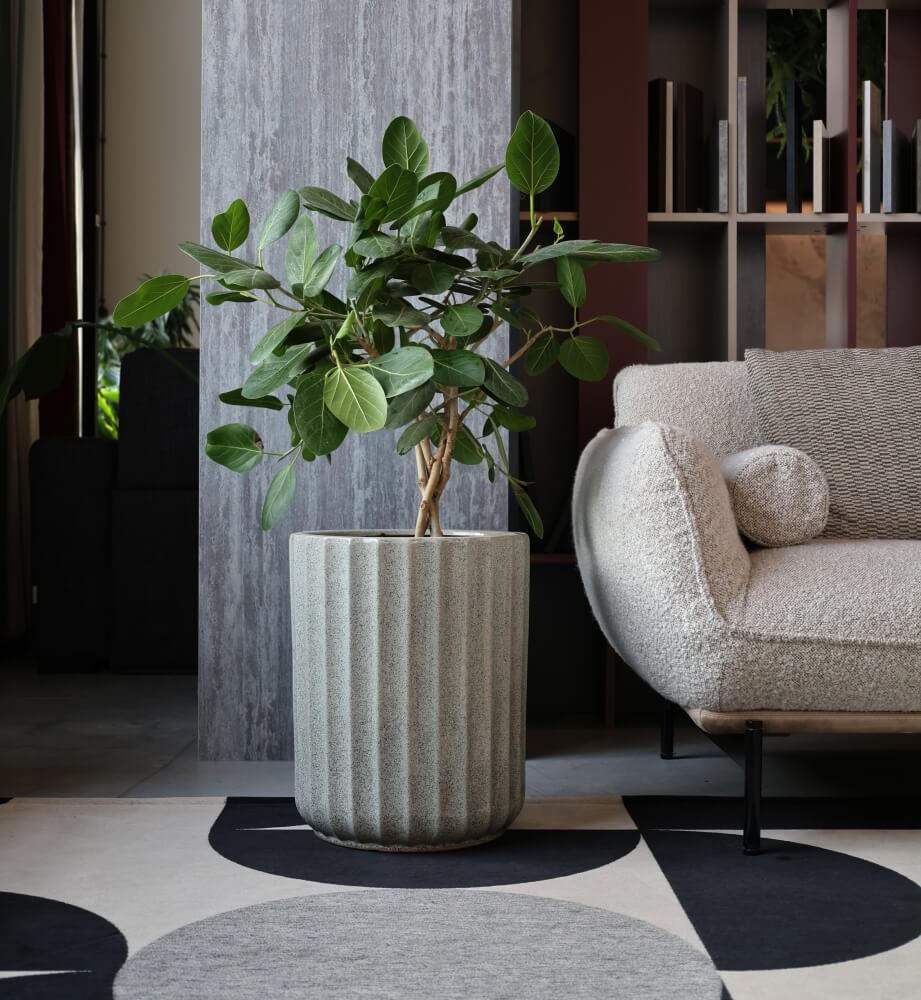 Wysoka, cylindryczna donica Mood to połączenie nowoczesnej formy z ponadczasowym materiałem. Jej elegancki wygląd i unikalna faktura sprawdzą się jako ozdoba salonu, przedpokoju lub przestronnego tarasu, gdzie będzie prezentować się wyjątkowo samodzielnie lub w towarzystwie innych roślin.