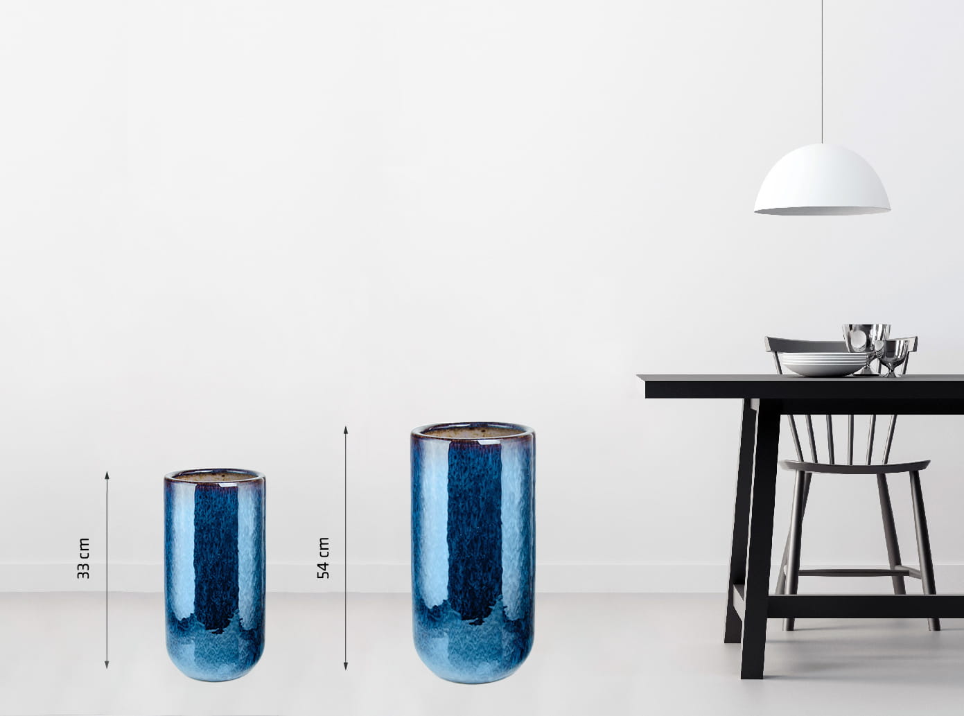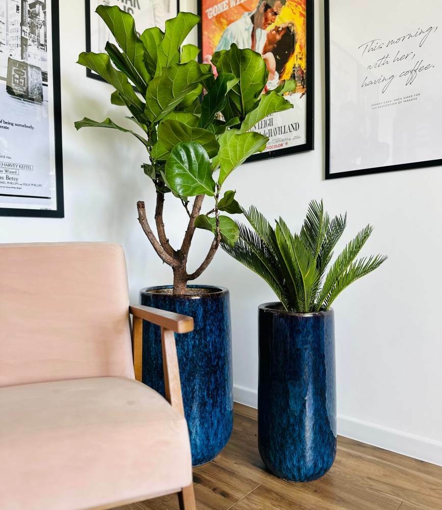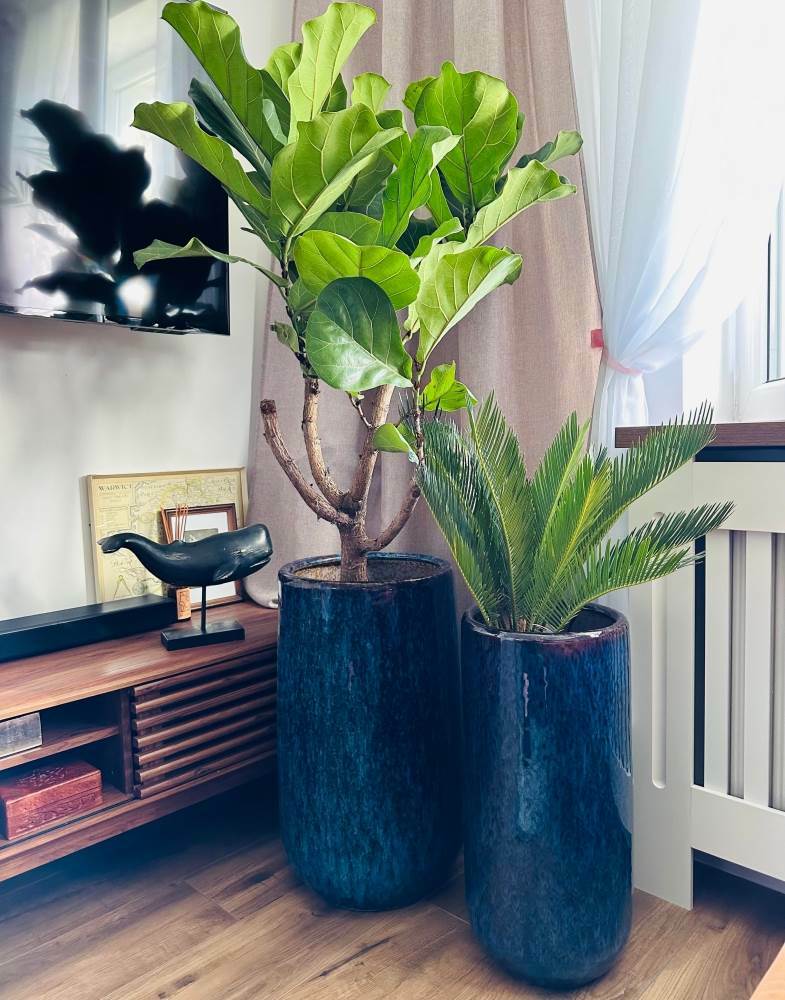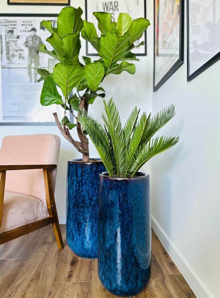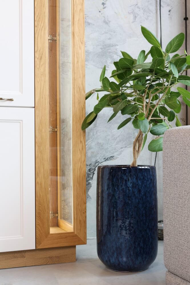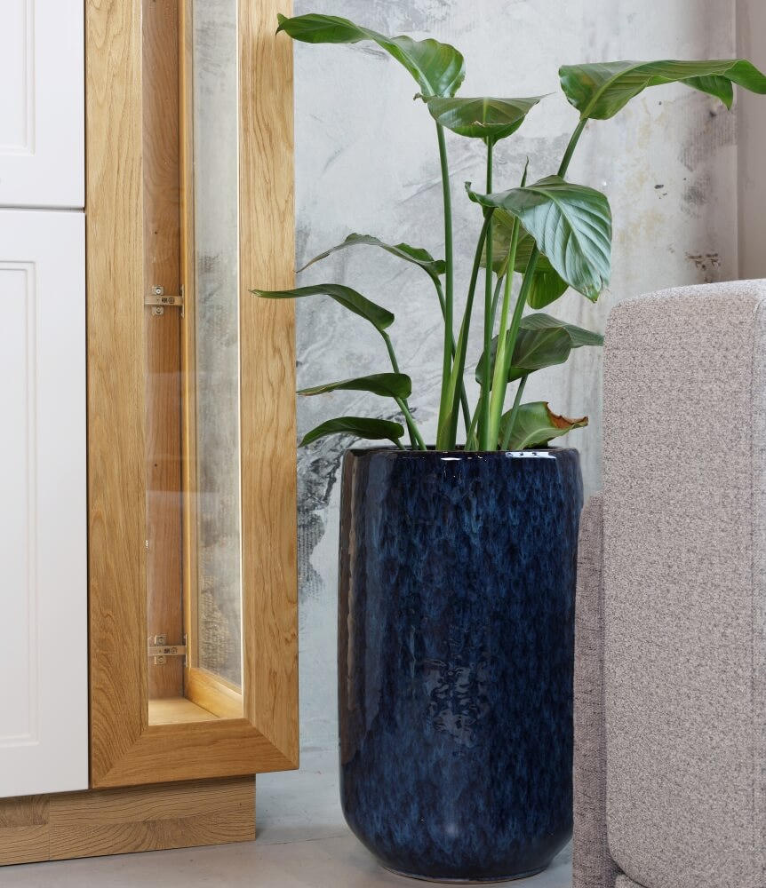To wysoka donica o okrągłej podstawie, która dzięki głębokiemu, nasyconemu niebieskiemu kolorowi i błyszczącemu wykończeniu stanie się eleganckim akcentem w Twoim wnętrzu. Wykonana z trwałej, szkliwionej ceramiki, jest unikatowa dzięki naturalnym zaciekom, które pojawiają się na jej powierzchni.
