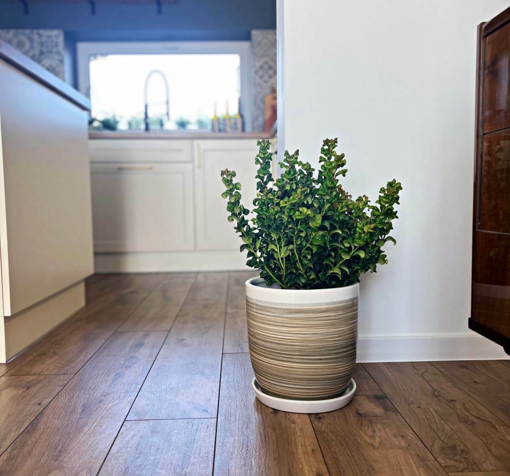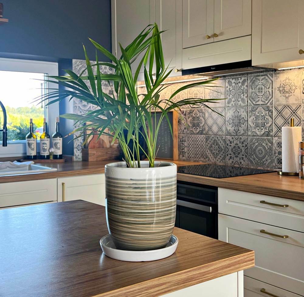 Dzięki klasycznej kolorystyce i uniwersalnemu kształtowi, ten model donicy pasuje do różnych wnętrz – od kuchni i salonu po przestrzeń biurową. Waga około 4 kg (bez rośliny i podłoża) zapewnia stabilność, ale nie utrudnia jej przestawienia w razie potrzeby. Pamiętaj, że ceramika szkliwiona nie jest mrozoodporna, więc donicę należy przechowywać w pomieszczeniu w okresie zimowym.