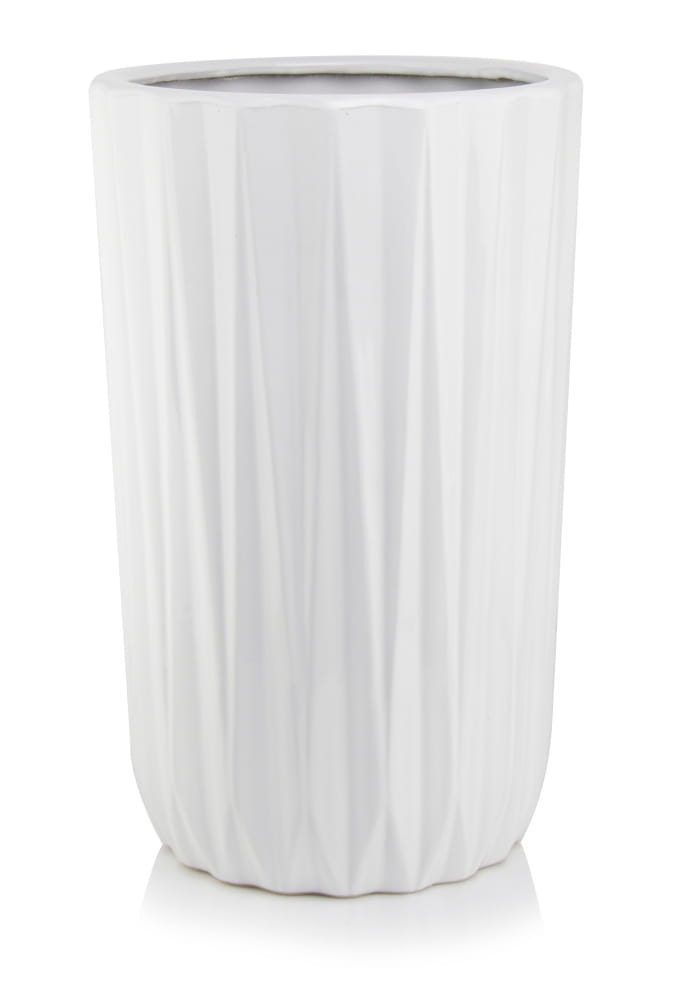 To wysoka, okrągła donica, której smukły, cylindryczny kształt i czysta, biała barwa wprowadzą do wnętrza świeżość. Subtelne, geometryczne wgłębienia na całej powierzchni dodają jej delikatnej tekstury i unikalnego charakteru, świetnie komponując się zarówno z minimalistycznymi, jak i bardziej industrialnymi aranżacjami.