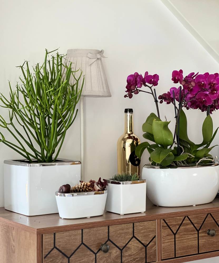 - Wykończenie White & Silver → Unikatowy efekt uzyskano dzięki procesowi galwanizacji; elektrolityczne srebro zdobi rant oraz wnętrze donicy, nadając jej metaliczny charakter, podczas gdy pozostała część zewnętrzna jest biała.