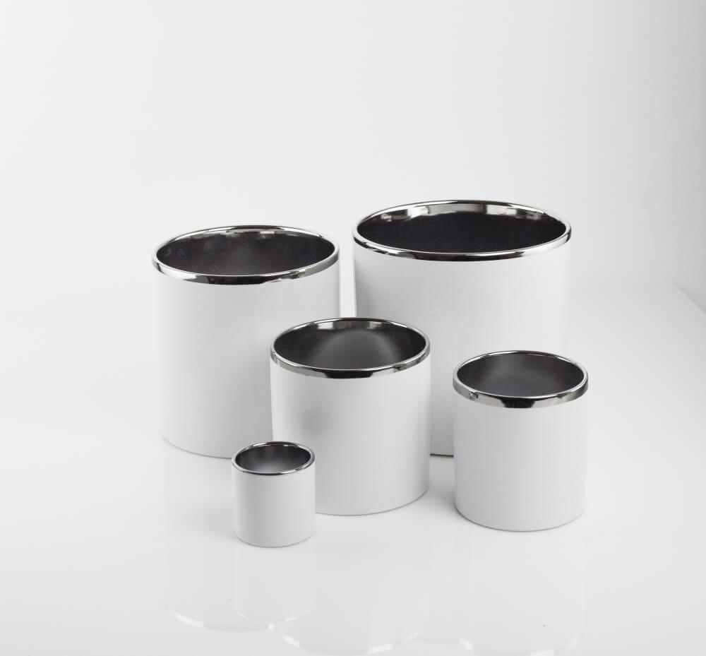 Elegancka, cylindryczna donica z kolekcji Moon, która łączy minimalistyczny kształt z luksusowym wykończeniem. Wykonana ręcznie z cienkościennej ceramiki, wyróżnia się dwukolorowym szkliwem w odcieniach bieli i srebra. To propozycja dla osób, które chcą dodać swojemu wnętrzu odrobinę blasku i stylu glamour.