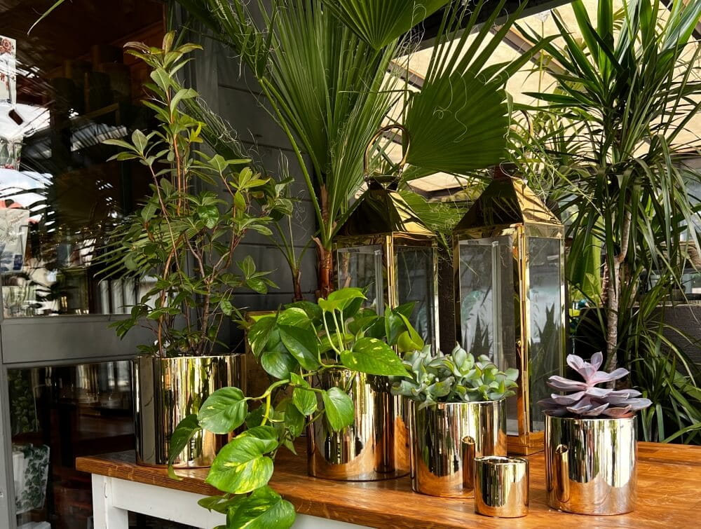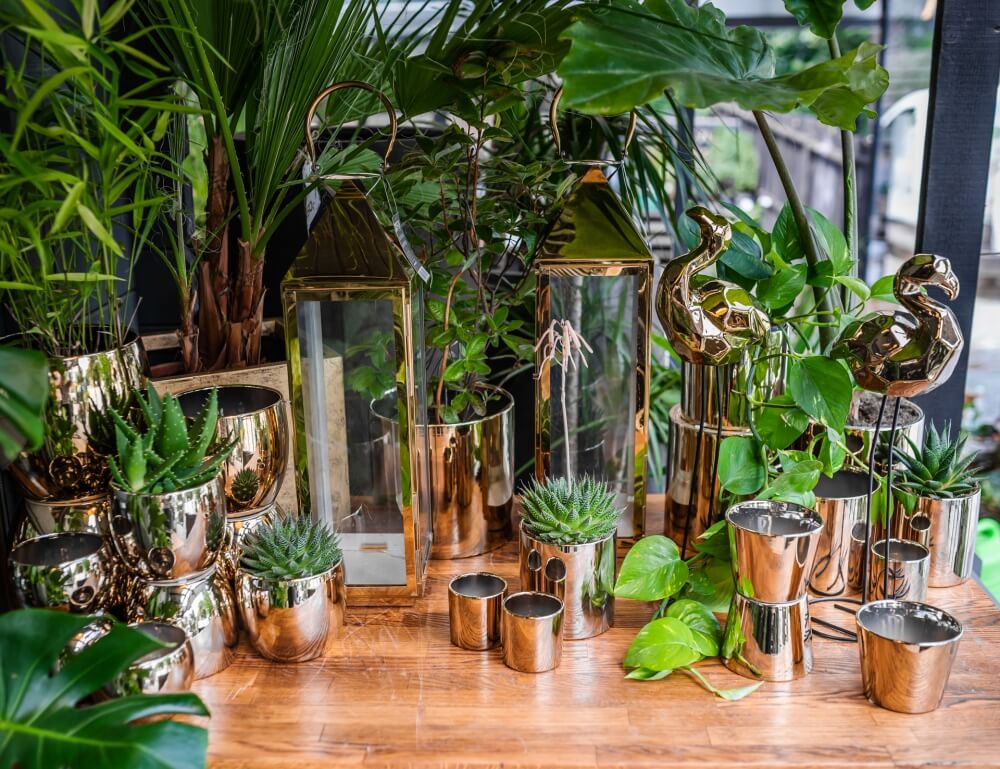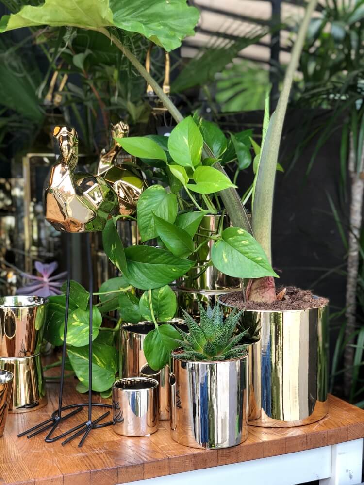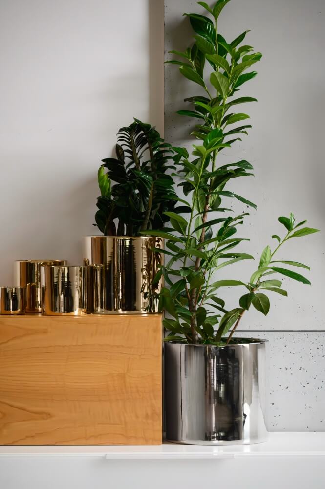- Kolor → Odcień złota to tzw. szampańskie złoto o delikatnej, chłodnej barwie. Elektrolityczna powłoka pokrywa całą donicę, zarówno na zewnątrz, jak i wewnątrz, nadając jej spójny, metaliczny charakter.