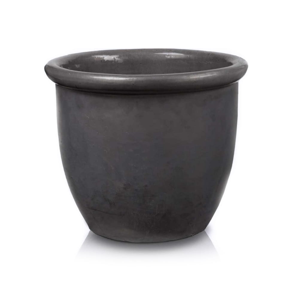To duża, okrągła donica ogrodowa o prostej, funkcjonalnej formie i pogrubionym rancie. Wykonana ręcznie z ceramiki szkliwionej, jest w pełni mrozoodporna i gotowa do całorocznego użytku na zewnątrz. Elegancki, antracytowy kolor i błyszczące wykończenie sprawiają, że pasuje zarówno do prywatnych ogrodów, jak i przestrzeni publicznych.