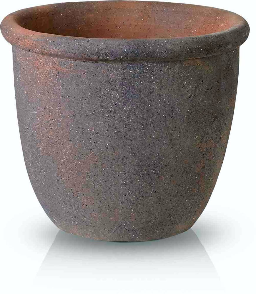 To duża, okrągła donica z mrozoodpornej kamionki, która dzięki swojej solidności i ponadczasowemu wyglądowi sprawdzi się zarówno w ogrodzie, jak i w przestrzeni publicznej. Jej ciemnobrązowa, matowa powierzchnia i masywna forma nadają otoczeniu charakteru, a funkcjonalny kształt zapewnia roślinom dużo miejsca na rozwój korzeni.