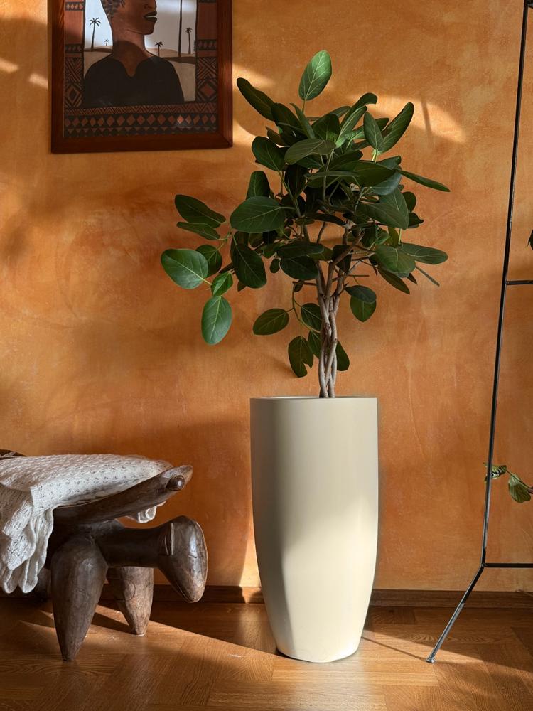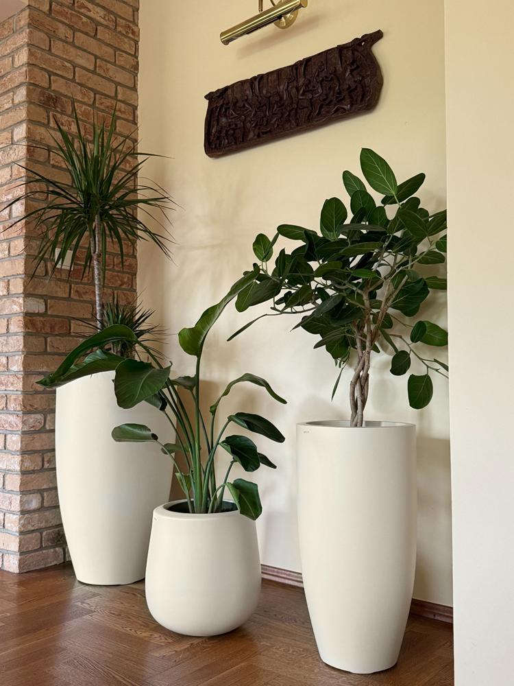 • Wymiary (średnica otworu 48 cm, podstawa 34 cm) → Smukły, wysoki kształt nadaje kompozycji elegancji i pionowy akcent, idealny dla roślin o wzniesionym pokroju.