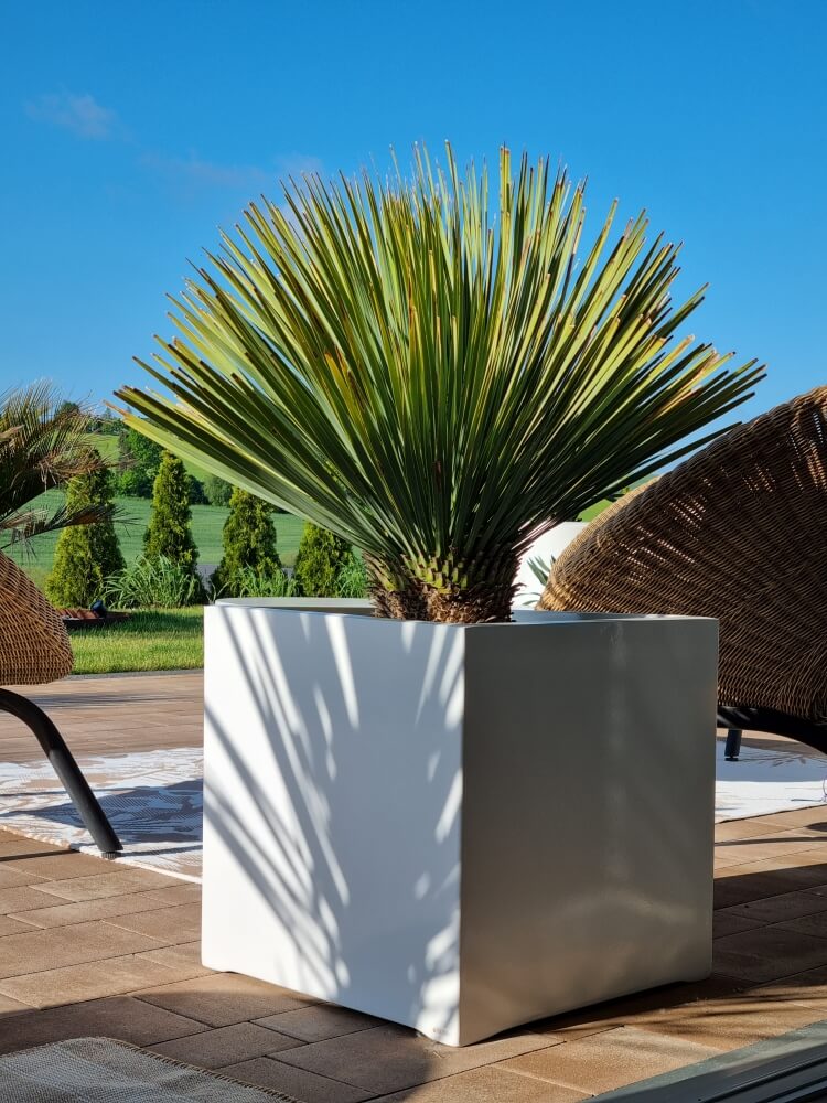 - Włókno szklane – materiał jest niezwykle trwały, odporny na uderzenia, promieniowanie UV i korozję, co gwarantuje długą żywotność donicy w każdych warunkach atmosferycznych.