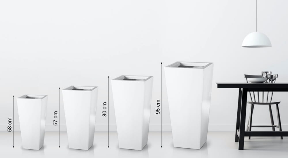 To wysoka, kwadratowa donica ogrodowa, która zwęża się ku dołowi, co nadaje jej nowoczesny i dynamiczny wygląd. Wykonana z wytrzymałego włókna szklanego, oferuje doskonałą odporność na kaprysy pogody i eleganckie, błyszczące wykończenie. Świetnie sprawdzi się zarówno w nowoczesnym ogrodzie, jak i na tarasie, dodając przestrzeni charakteru.