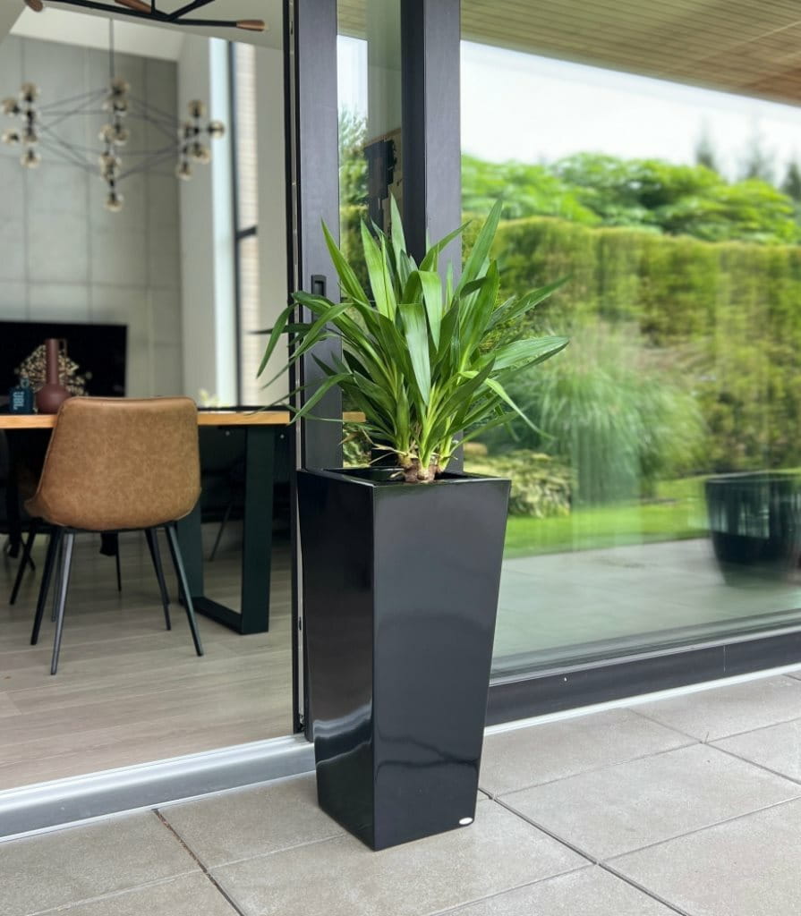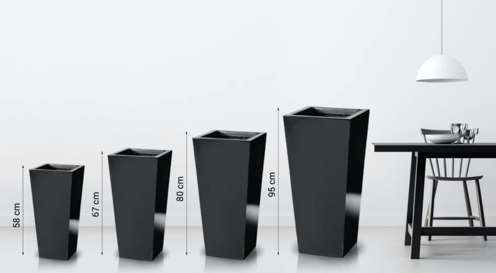 Wysoka donica o kwadratowym przekroju, która elegancko zwęża się ku dołowi. Jest to model z wbudowaną wewnętrzną półką, który łączy wytrzymałość włókna szklanego z funkcjonalnością. Idealnie sprawdzi się do ekspozycji roślin w nowoczesnych ogrodach, na tarasach czy w reprezentacyjnych przestrzeniach miejskich.