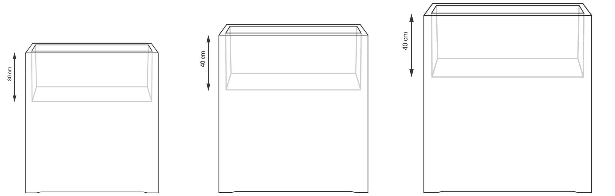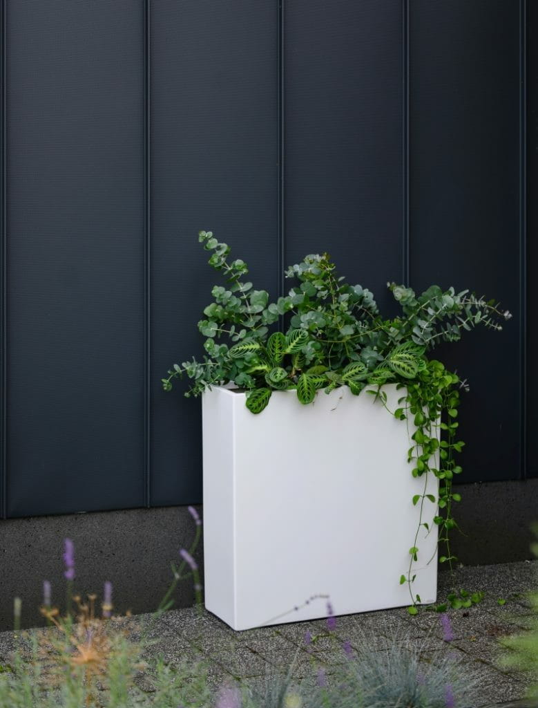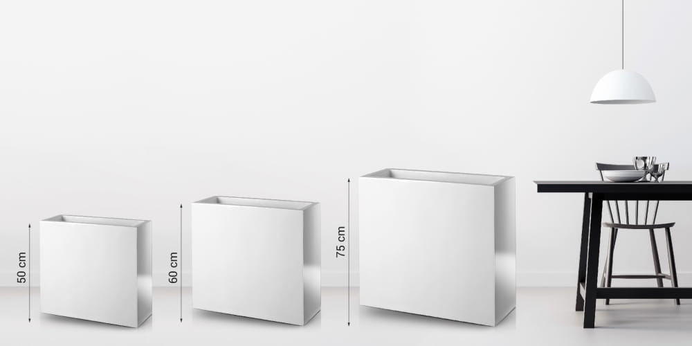 To wysoka, podłużna donica o prostokątnej podstawie, wykonana z wytrzymałego włókna szklanego. Zapewnia nowoczesny, minimalistyczny wygląd i jest gotowa do użycia od razu po wyjęciu z opakowania, ponieważ posiada wbudowaną wewnętrzną półkę. Świetnie sprawdzi się zarówno w nowoczesnych ogrodach, jak i na tarasach czy w przestrzeniach komercyjnych, gdzie potrzebna jest elegancka i praktyczna donica.