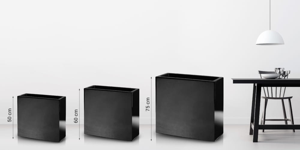 To podłużna, wysoka donica ogrodowa, która dzięki solidnemu wykonaniu z włókna szklanego (fiberglass) jest odporna na kaprysy pogody i może służyć przez lata. Jej smukły, prostokątny kształt sprawdzi się jako nowoczesna, zielona przegroda na tarasie, w ogrodzie lub w przestrzeni miejskiej.