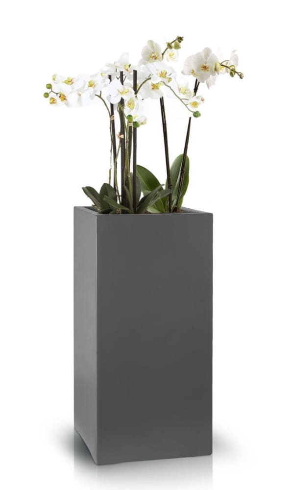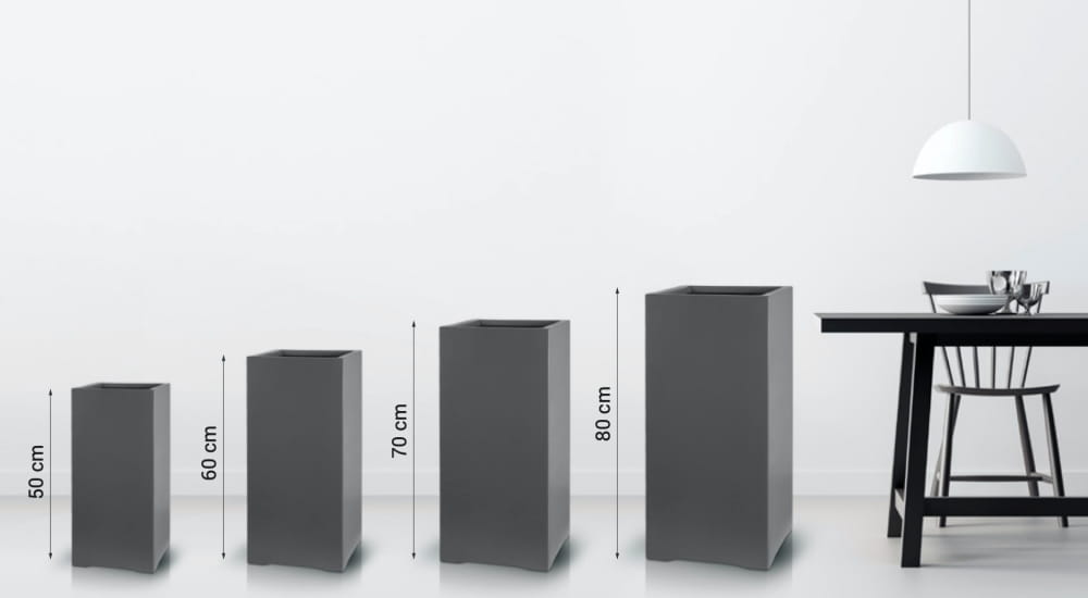 To wysoka, nowoczesna donica o kwadratowej podstawie, wykonana z wytrzymałego włókna szklanego. Model wyposażony jest w praktyczną, wewnętrzną półkę, która ułatwia organizację drenażu i sadzenie. Świetnie sprawdzi się w ogrodzie, na tarasie lub balkonie, wprowadzając elegancki, grafitowy akcent.