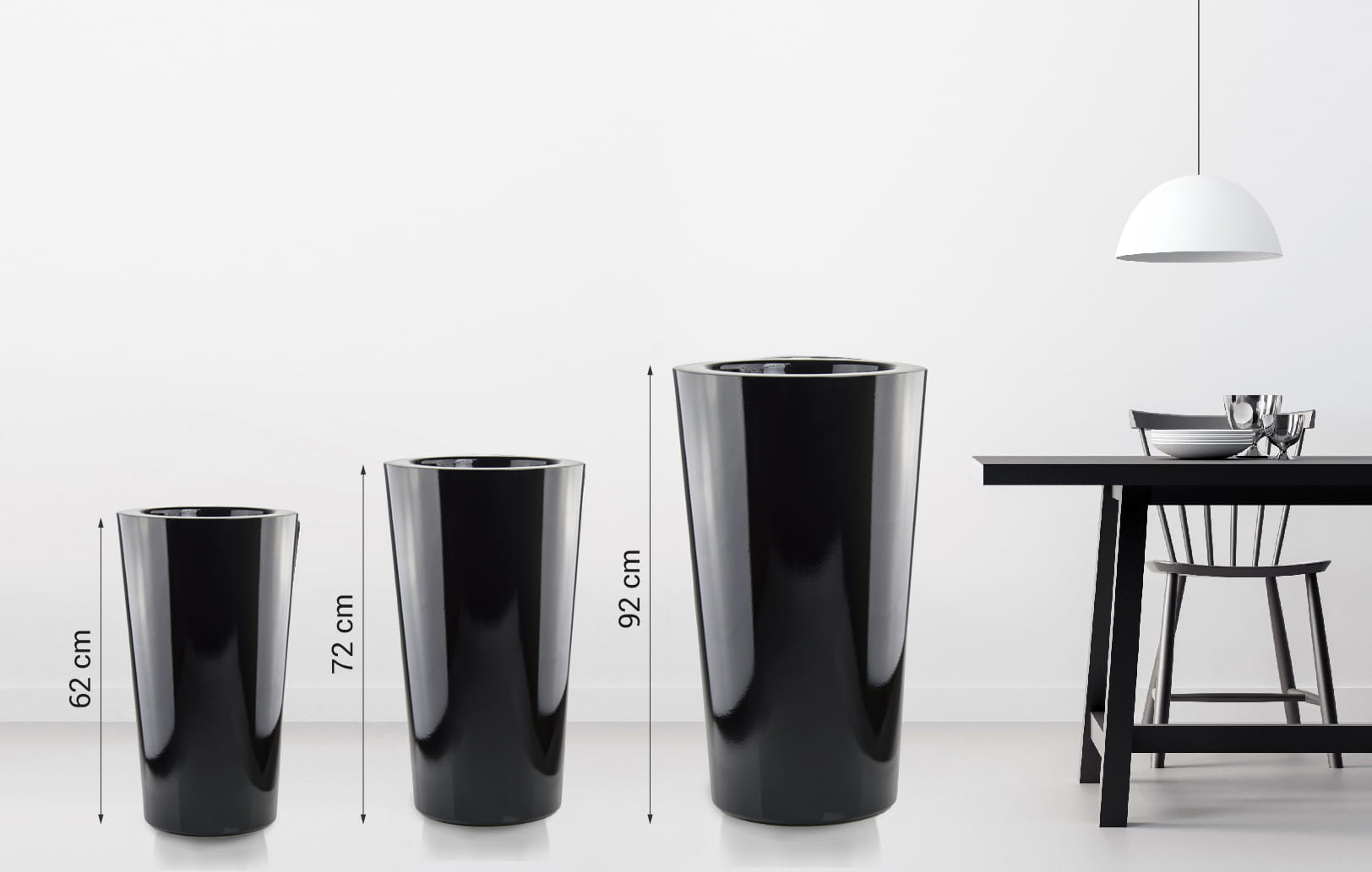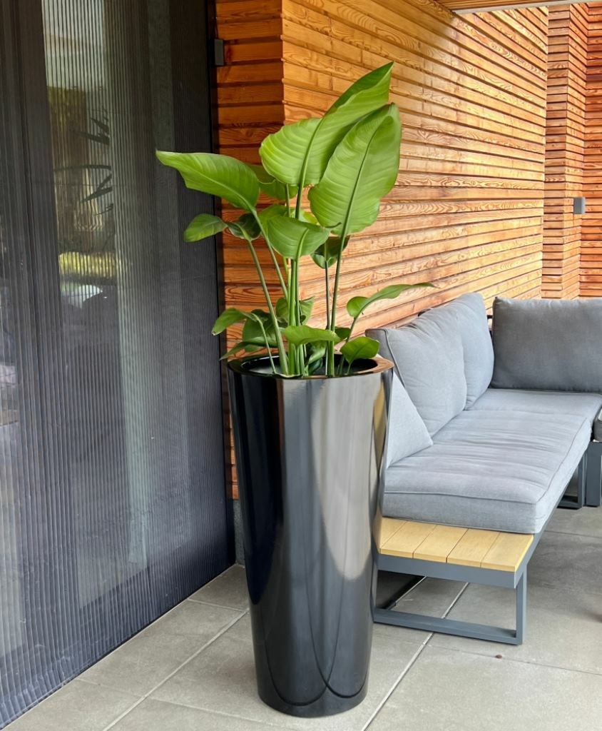 - Wykończenie i kolor → Gładka, błyszcząca, czarna powierzchnia podkreśla nowoczesną formę i łatwo ją utrzymać w czystości, a kolor doskonale komponuje się z zielenią roślin.