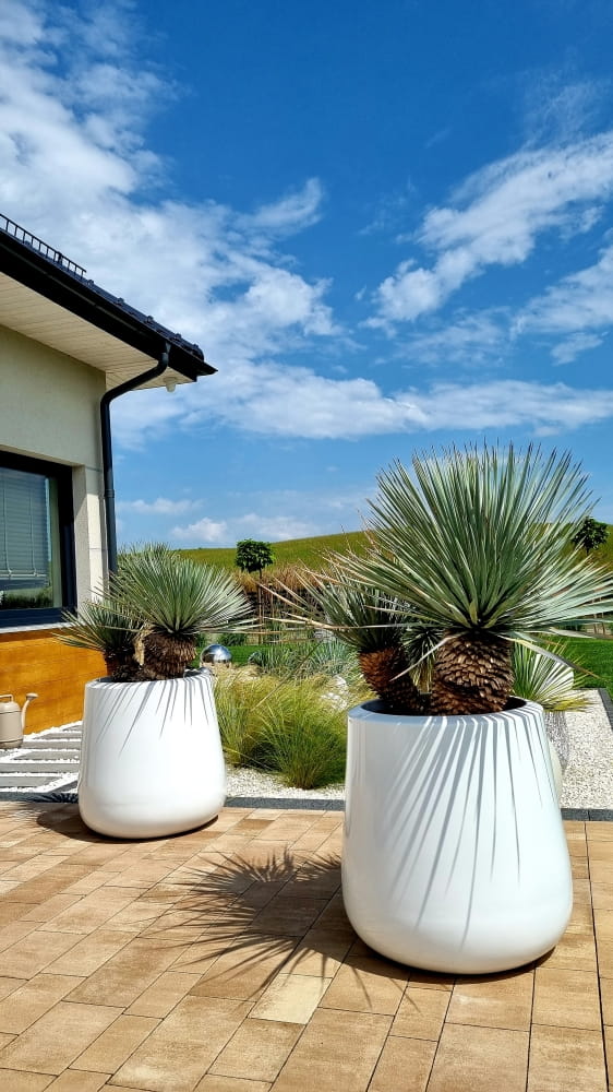 Jej pojemność i kształt świetnie sprawdzą się jako soliter dla okazałego drzewka oliwnego, lauru czy małego iglaka, tworząc efektowny punkt centralny w przestrzeni. Dzięki lekkości materiału, nawet tak duży model jest stosunkowo łatwy do przestawienia, co ułatwia zmiany aranżacji. Biały, błyszczący kolor doskonale rozświetla zacienione zakątki i harmonijnie komponuje się z zielenią roślin oraz nowoczesną architekturą. Pamiętaj, że aby zapewnić roślinom optymalne warunki i wykorzystać pełną mrozoodporność donicy, warto samodzielnie wykonać w jej dnie otwory odpływowe.