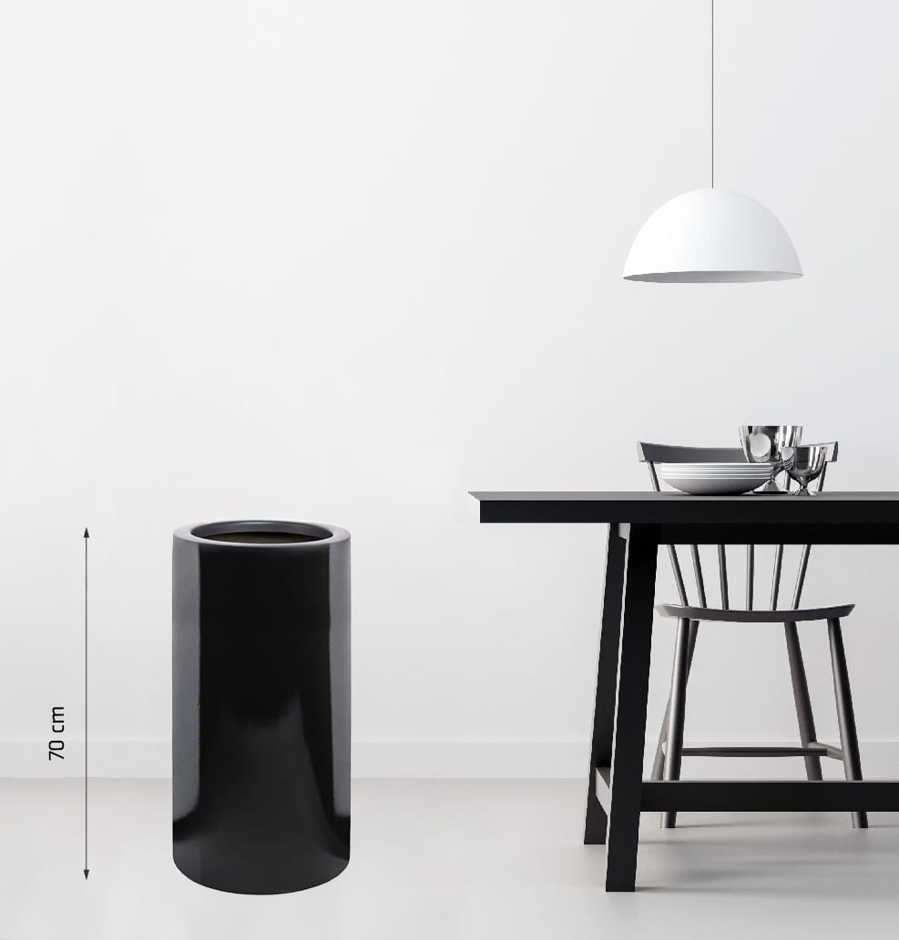 To duża, cylindryczna donica ogrodowa wykonana z wytrzymałego włókna szklanego. Dzięki mrozoodporności i eleganckiemu, błyszczącemu wykończeniu w kolorze czarnym będzie ozdobą nowoczesnych tarasów i ogrodów. Produkt polski.