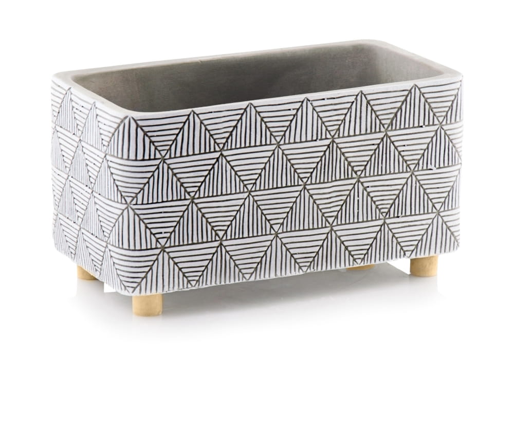 To ceramiczna osłonka o prostokątnej podstawie, osadzona na drewnianych nóżkach z drzewa herbacianego. Jej rustykalna, matowa faktura celowo nawiązuje do surowego betonu, a geometryczne wzory na ściankach dodają unikalnego detalu. Dzięki minimalistycznemu designowi i naturalnemu wyglądowi doskonale podkreśla urodę roślin, nie dominując w aranżacji – sprawdzi się w nowoczesnych wnętrzach i tych utrzymanych w klimacie boho.