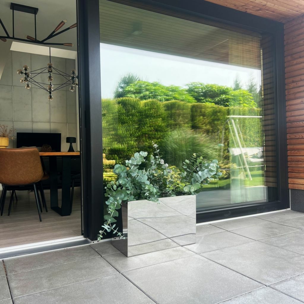To duża, podłużna donica o prostokątnej podstawie, wykonana w całości z certyfikowanej stali nierdzewnej. Jej lustrzane, polerowane wykończenie nadaje elegancki charakter, a dzięki mrozoodporności sprawdzi się w ogrodzie przez cały rok. To praktyczne i efektowne rozwiązanie do aranżacji zarówno prywatnych tarasów, jak i reprezentacyjnych przestrzeni publicznych.