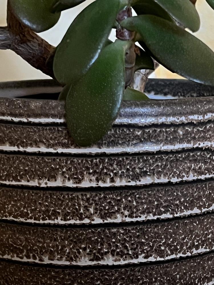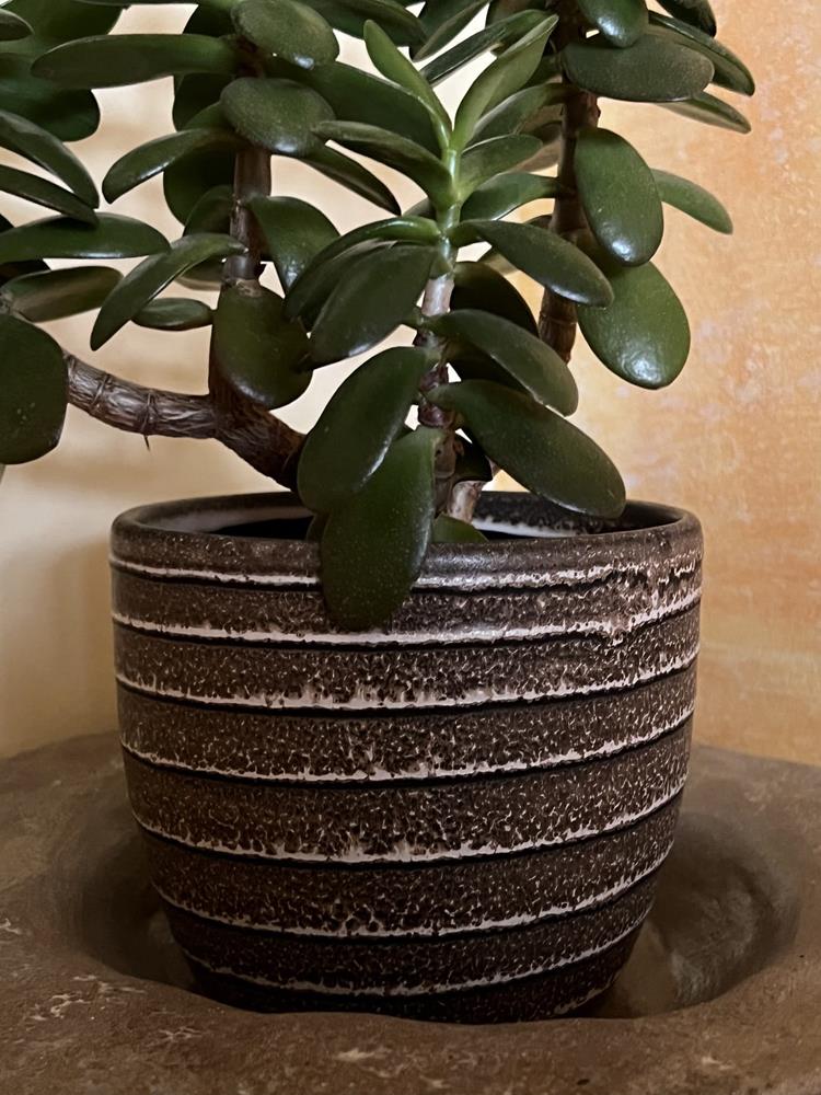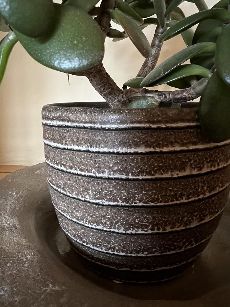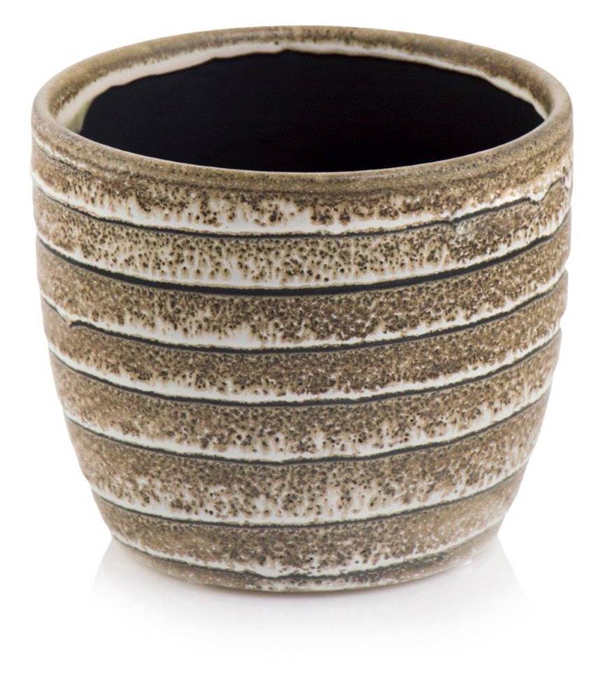 Ceramiczna osłonka doniczkowa w tradycyjnym kształcie z pięknie układającymi się poziomymi żebrowaniami. Bardzo ciekawa kolorystyka pastelowy brąz poszatkowany kremowym beżem na całej wysokości tworząca intrygujący i ciekawy pattern. Propozycja subtelna, stonowana, ale posiadająca swój indywidualny charakter, swoim wyglądem razem z roślinnością doda atrakcyjności każdemu wnętrzu.