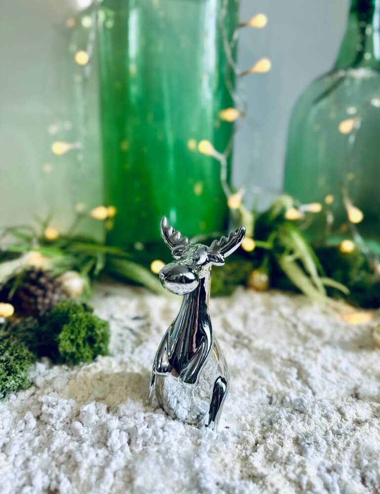 Ta urocza, ręcznie wykonana figurka renifera to klasyczna ozdoba, która wprowadzi świąteczną atmosferę do Twojego domu. Jej srebrzysty, lustrzany kolor błyszcząco podkreśli charakter każdego wnętrza, a kompaktowy rozmiar sprawi, że znajdzie dla siebie miejsce na kominku, stole czy półce w pokoju dziecięcym.