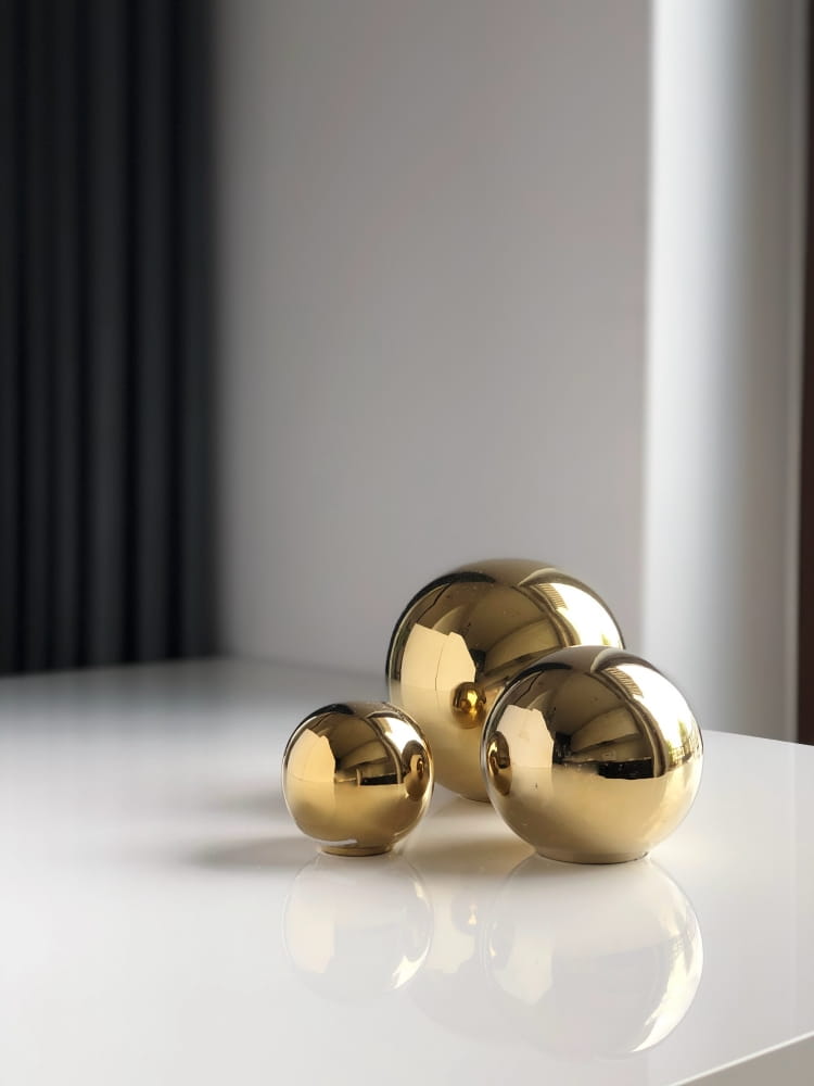 - Lustrzane, złote wykończenie → Powierzchnia odbija otoczenie jak zwierciadło, dodając przestrzeni głębi i światła.
