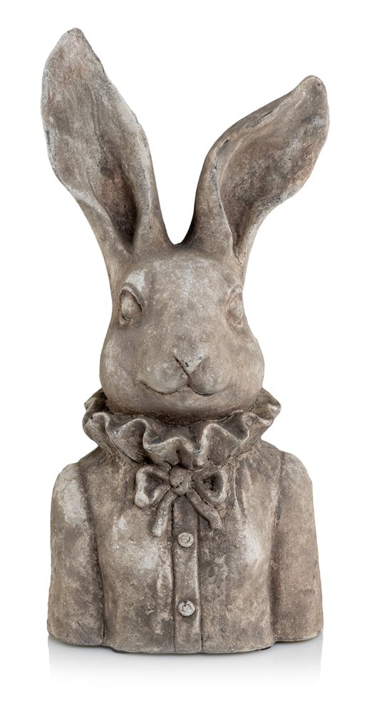 Stylizowana figura zająca jest nieodłącznym symbolem związanym ze świętami Wielkiej Nocy, dodającym wiele uroku i potęgującym świąteczną atmosferę. Najstarsze źródła łączące zajączka ze świętami Wielkanocnymi pochodzą z XVII w., wtedy zaczął uczestniczyć w aranżacjach świątecznych. Symbolicznie zające odnalazły się w wielu odsłonach jako zwiastuny wiosny i nowego życia, zając występował również jako stworzenie przynoszące pisanki i upominki. Zajączki symbolizują również czujność i niewinność oraz radość świąteczną i nadzieję. Wyjątkowo urokliwy zając, prezentujący się nad wyraz elegancko, dzięki ozdobnemu kołnierzowi przypominający królika z powieści „Alicja w krainie czarów”. Figury zajęcy można z powodzeniem aranżować w różnych wariantach jako samodzielne ozdoby, można tworzyć grupy zajęcy, jak również doskonale wyglądają w kompozycjach z innymi elementami dekoracyjnymi np. z zielenią roślin.  Figurki zajęcy stanowią niezmiennie wdzięczny i cenny element w wielu świątecznych aranżacjach. Wykończenie stylizowane na beton architektoniczny dodaje figurce naturalności i szlachetnej surowości, nie zabierając jednocześnie bijącego od niej ciepła i czaru.