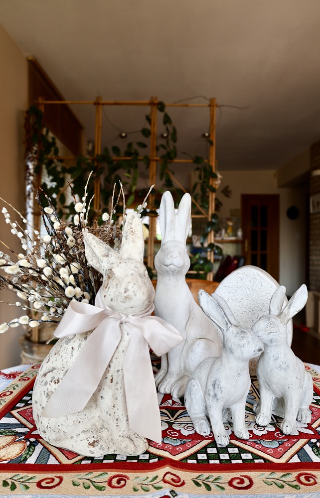 Stylizowana figura zająca jest nieodłącznym symbolem związanym ze świętami Wielkiej Nocy, dodającym wiele uroku i potęgującym świąteczną atmosferę. Najstarsze źródła łączące zajączka ze świętami Wielkanocnymi pochodzą z XVII w., wtedy zaczął uczestniczyć w aranżacjach świątecznych. Symbolicznie zające odnalazły się w wielu odsłonach jako zwiastuny wiosny i nowego życia, zając występował również jako stworzenie przynoszące pisanki i upominki. Zajączki symbolizują również czujność i niewinność oraz radość świąteczną i nadzieję. Wyjątkowo urokliwy zajączek, podpierający zatopioną w marzeniach głowę, pozwoli cieszyć się figurką w wielu świątecznych dekoracjach. Figury zajęcy można z powodzeniem aranżować w różnych wariantach jako samodzielne ozdoby, można tworzyć grupy zajęcy, jak również doskonale wyglądają w kompozycjach z innymi elementami dekoracyjnymi np. z zielenią roślin. Figurki zajęcy stanowią niezmiennie wdzięczny i cenny element w wielu świątecznych aranżacjach. Białe wykończenie dodaje im uroku świeżości i czystości nie zabierając jednocześnie bijącego od nich ciepła i czaru.