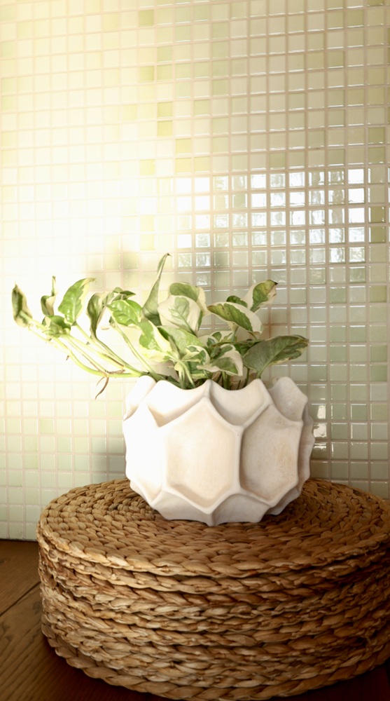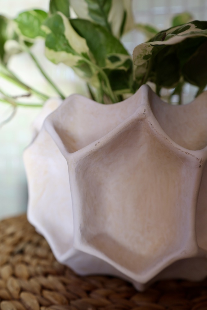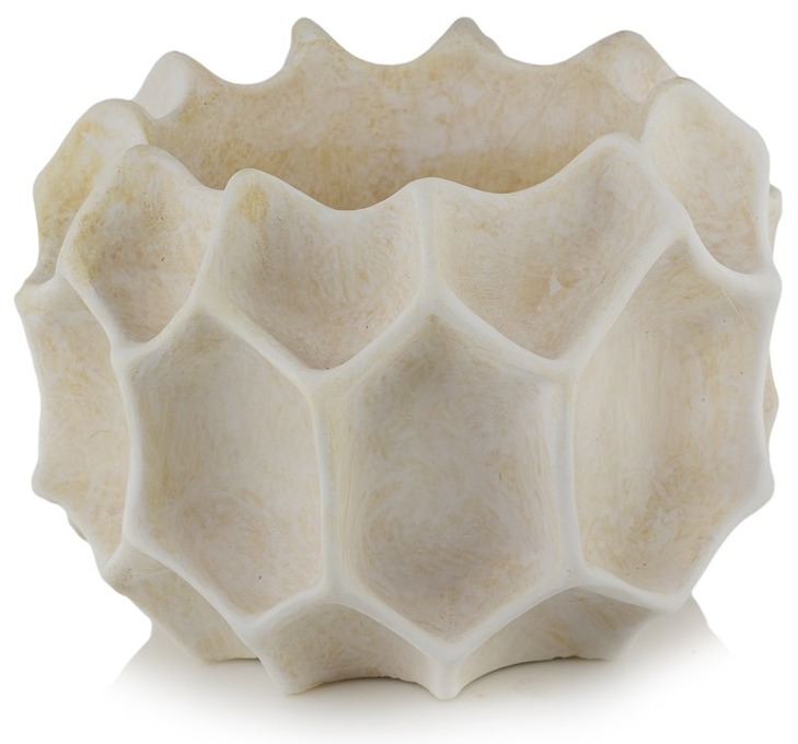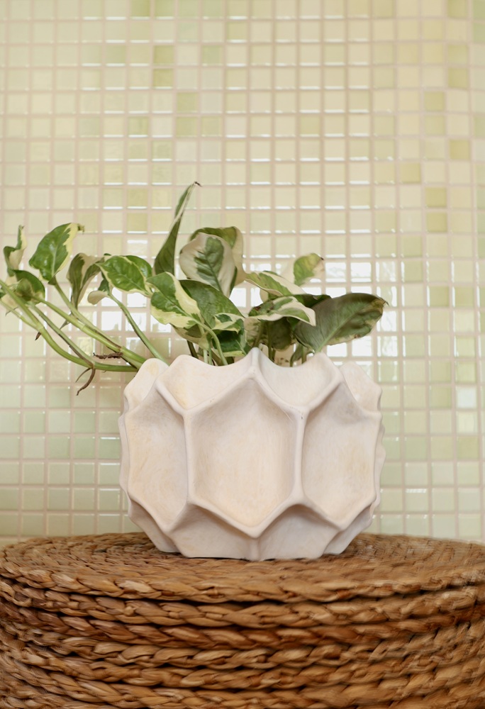 Ceramiczna o niezwykle intrygującej, przestrzennej fakturze inspirowanej pięciokątną strukturą atomu. Jej powierzchnia jest jak misterna rzeźba geometryczna składająca się z przylegających do siebie nieregularnych, wielowymiarowych pięciokątów, tworzących efekt głębi. Doniczka posiada artystyczny, futurystyczny charakter. Łagodzony poprzez neutralną, subtelną kolorystykę, efektownie i harmonijnie łączącą się z zielenią roślin. Ręcznie szkliwione matowe powierzchnie wraz z niecodziennym designem to wyrazista dekoracja łącząca naturę z nowoczesną formą.