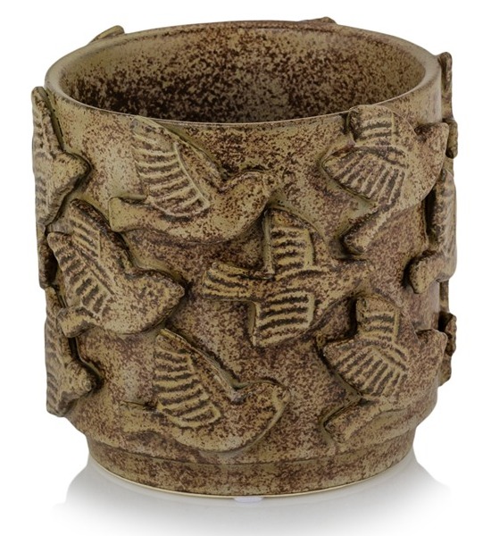Ceramiczna osłonka doniczkowa ozdobiona stylizowanymi, lecącymi ptakami, niosącymi ze sobą poczucie wolności, wyzwolenia, podróży w nieznane. Brązowa kolorystyka emanuje naturalnym ciepłem, ciemniejsze odcienie brązu podkreślają kontury wzoru i tworzą subtelny kontrast nadający całości głębi i dynamiki. Ptasi ornament wydaje się żyć własnym rytmem, płynąc spokojnie wokół doniczki. To projekt łączący w sobie prostotę natury i artyzm wraz z nutą zadumy.