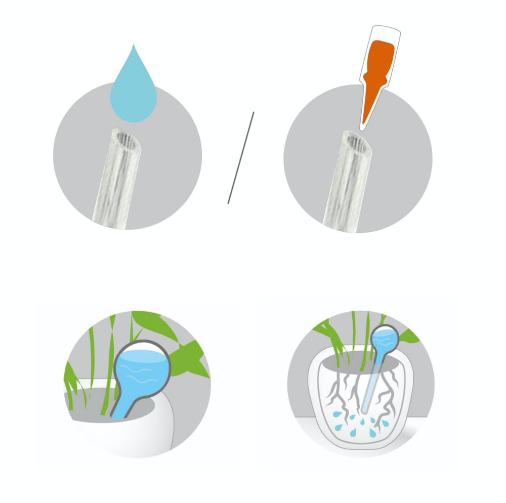 Nawadniacz jest przeznaczony do użytku wewnętrznego. Jego działanie opiera się na prostej zasadzie: woda powoli przesącza się przez wąską rurkę bezpośrednio do podłoża, gdy tylko roślina tego potrzebuje. To doskonałe rozwiązanie dla osób zapracowanych, często podróżujących lub po prostu zapominalskich, które chcą zapewnić swoim roślinom stałą i równomierną wilgotność. Możesz go używać zarówno z czystą wodą, jak i z rozcieńczonym nawozem płynnym, aby dostarczyć roślinom składników odżywczych podczas Twojej nieobecności.