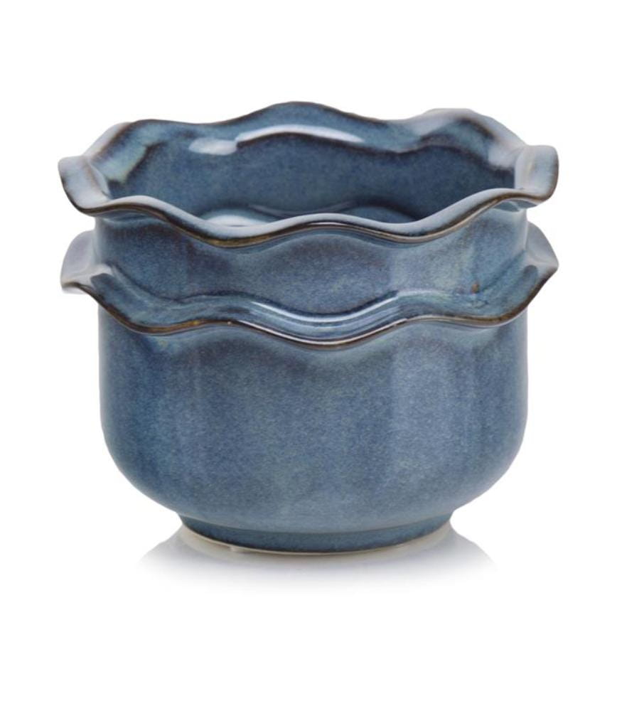Ceramiczna osłonka doniczkowa przykuwająca wzrok wyjątkowym elementem dekoracyjnym, przypominającym uroczą falbankę. Nowoczesna forma spotyka się z nutą nostalgii i romantyzmu, wszystko razem ujęte w subtelną i elegancką całość. Ciemno niebieskie, z rudymi akcentami to pełne szlachetności zestawienie kolorystyczne. Doniczka przykuwająca wzrok w każdym wnętrzu, wnosząca swój charakter i niepowtarzalne wzornictwo.