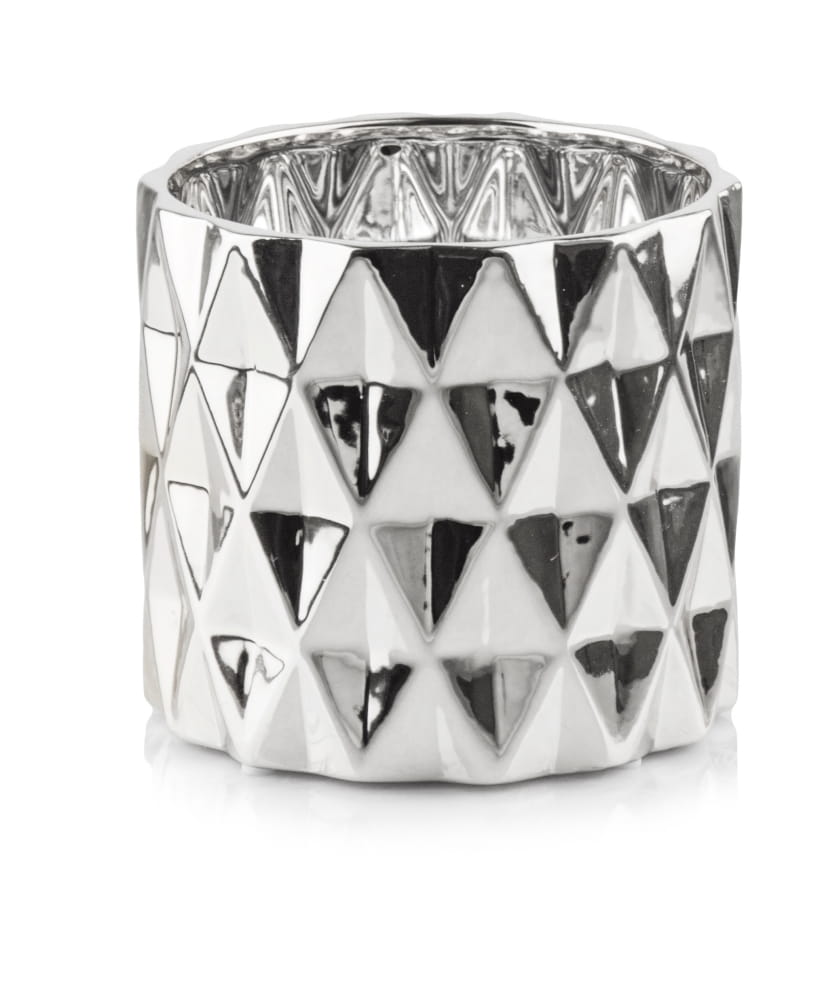 Ta osłonka z kolekcji Moon to elegancki, cylindryczny model, który błyszczy dosłownie i w przenośni. Wykonana z cienkościennej ceramiki i pokryta lustrzanym szkliwem srebrnym, doskonale odbija światło i otoczenie, dodając przestrzeni glamourowego charakteru. Jej ścianki ozdobione są subtelnymi, geometrycznymi wzorami, co czyni ją dekoracyjnym detalem dla osób ceniących sobie estetykę i styl.