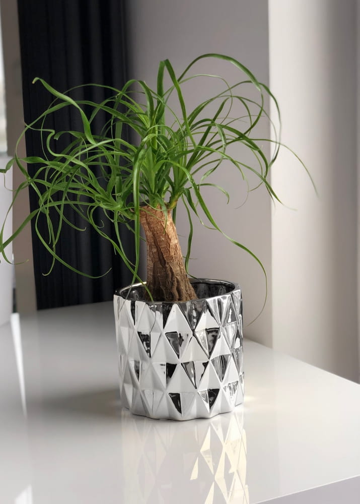 Ta osłonka świetnie sprawdzi się jako elegancka oprawa dla małych sukulentów, kaktusów lub innych roślin o zwartym pokroju. Jej lustrzana powierzchnia będzie pięknie współgrać z nowoczesnymi i minimalistycznymi aranżacjami, ale też ożywi bardziej klasyczne wnętrza. Pamiętaj, że to dekoracyjna osłonka – do środka wkładasz roślinę w swojej oryginalnej, plastikowej doniczce, co dodatkowo chroni ceramikę przed bezpośrednim kontaktem z wilgocią.