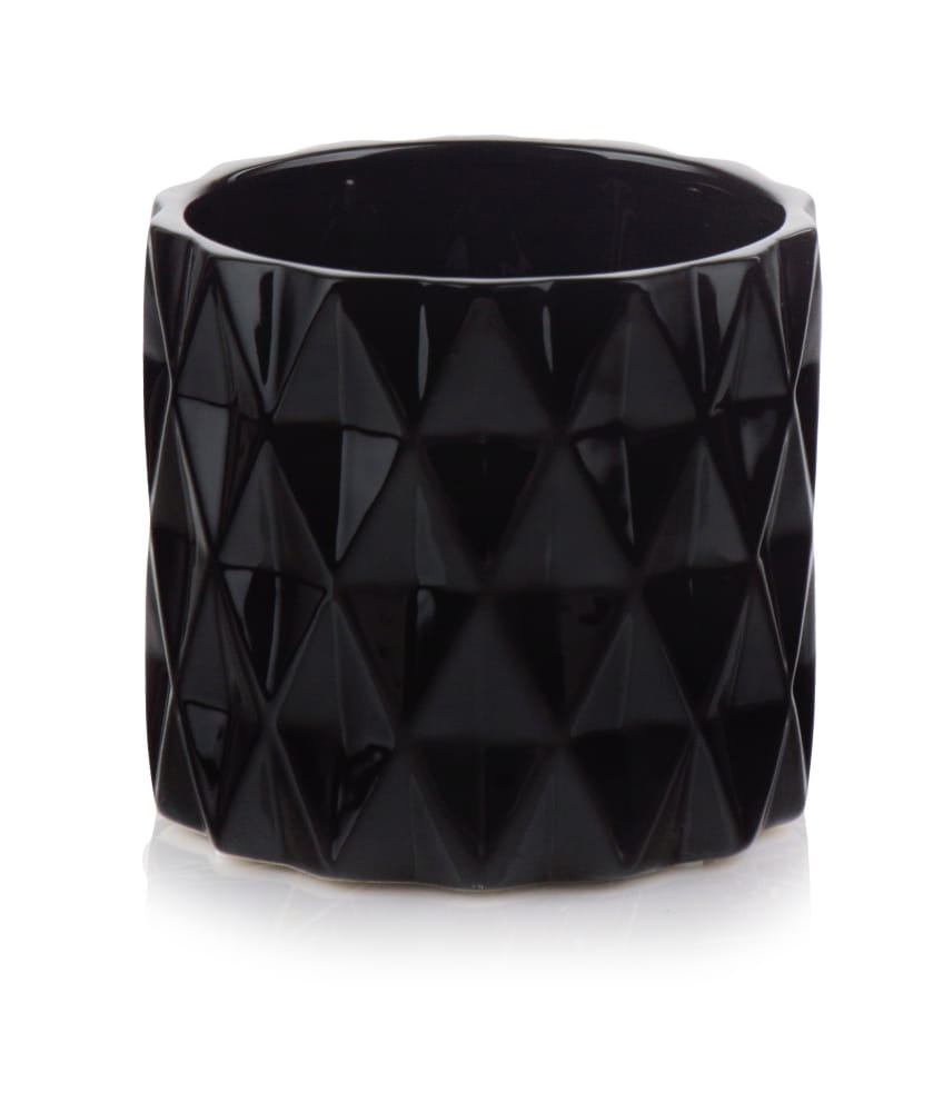To elegancka, cylindryczna osłonka wykonana ręcznie z ceramiki, która sprawdzi się jako dekoracja dla mniejszych roślin doniczkowych. Jej klasyczny, czarny kolor i geometryczny wzór na ściankach dodadzą charakteru każdemu wnętrzu, od nowoczesnego biura po przytulny parapet w salonie.