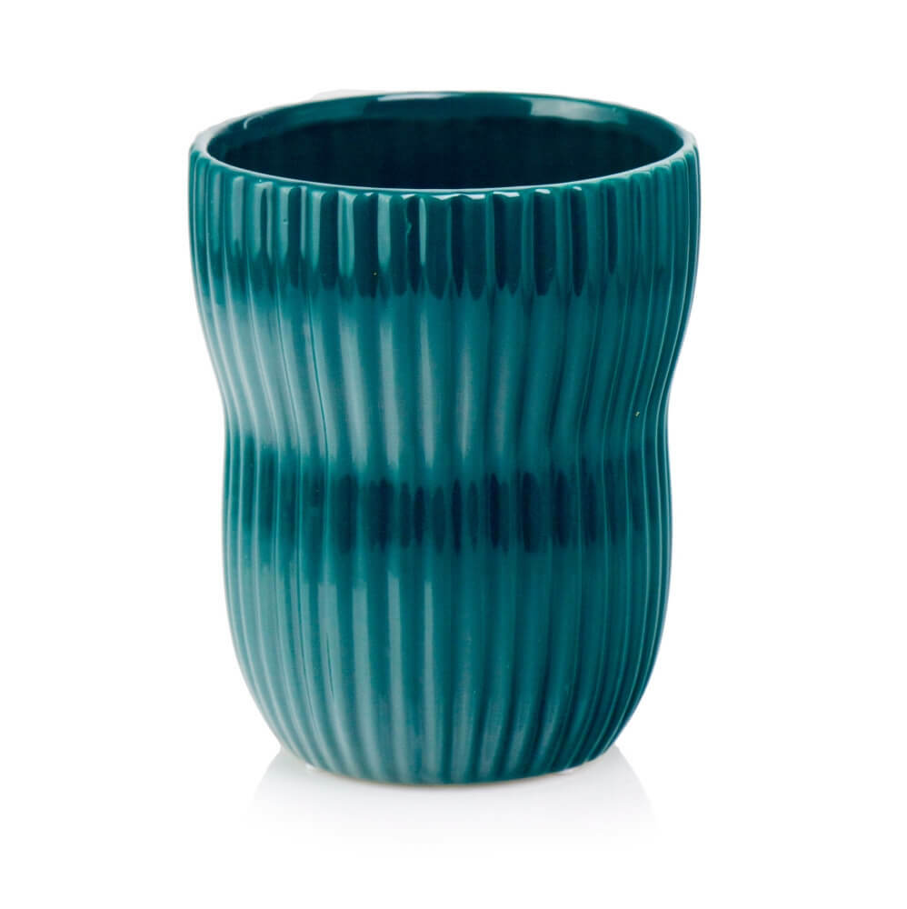 • Kolor i wzór → Intensywny turkusowy kolor w połączeniu z pionowymi prążkami tworzy nowoczesną i przyciągającą uwagę dekorację.