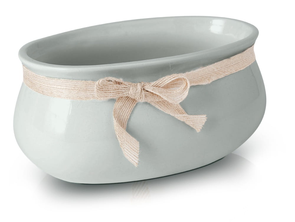 Owalna osłonka ceramiczna o charakterystycznym beczułkowatym kształcie, która dzięki subtelnemu szaremu kolorowi i błyszczącemu wykończeniu pasuje do wielu stylów wnętrz. Jej ręcznie wykonana, szkliwiona powierzchnia jest ozdobiona elegancką wstążką, co dodaje jej unikalnego, dekoracyjnego charakteru.